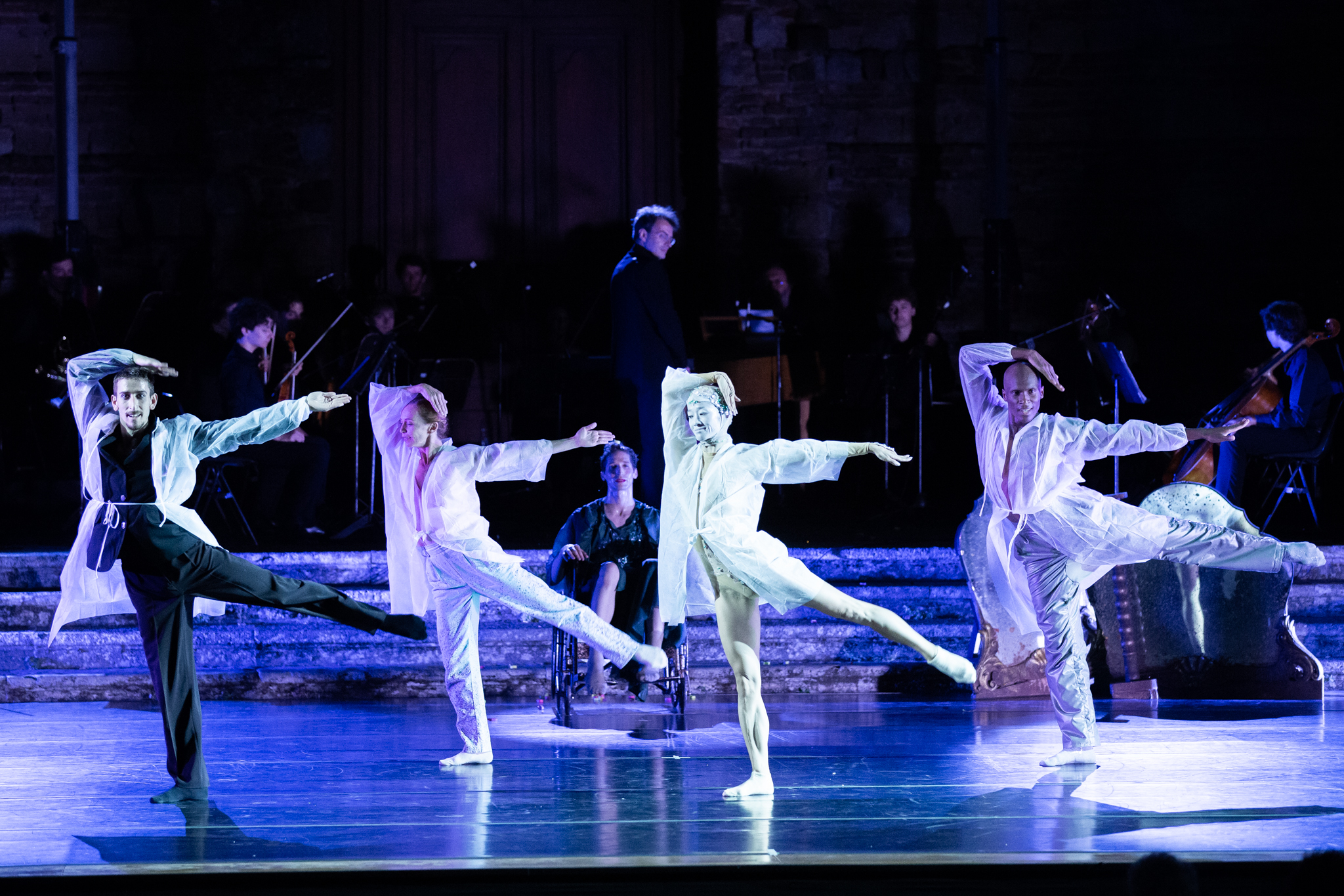 Alternando, tra assoli e duetti, una gestualità netta a movimenti fluidi, a posture pittoriche, a sequenze di gruppo esaltate dalle incisive luci, è la musica a determinare l’atmosfera dei due piani di realtà e i moti dell’animo, musica che spazia su diverse arie di Bach con incursioni di suoni minimal e musica popolare danese di Dan Haugaard e del gruppo Folkstow. Ben calato nei panni del-della protagonista è Sasha Riva, Simone Repele in quello dell’intrattenitore e narratore, e con loro nel ruolo forte di Gerda una sempre magnetica Silvia Azzoni dell’Hamburg Ballet e i colleghi Yumi Aizawa e Jamal Callender.