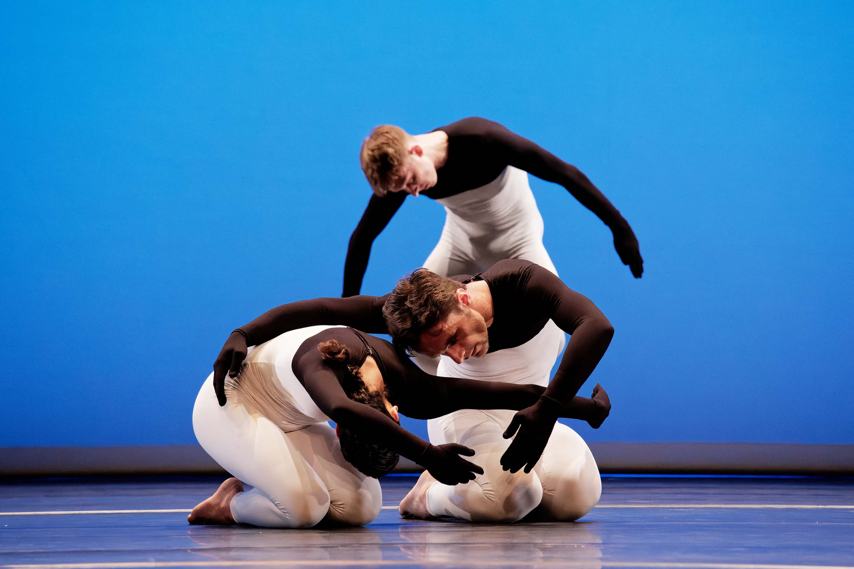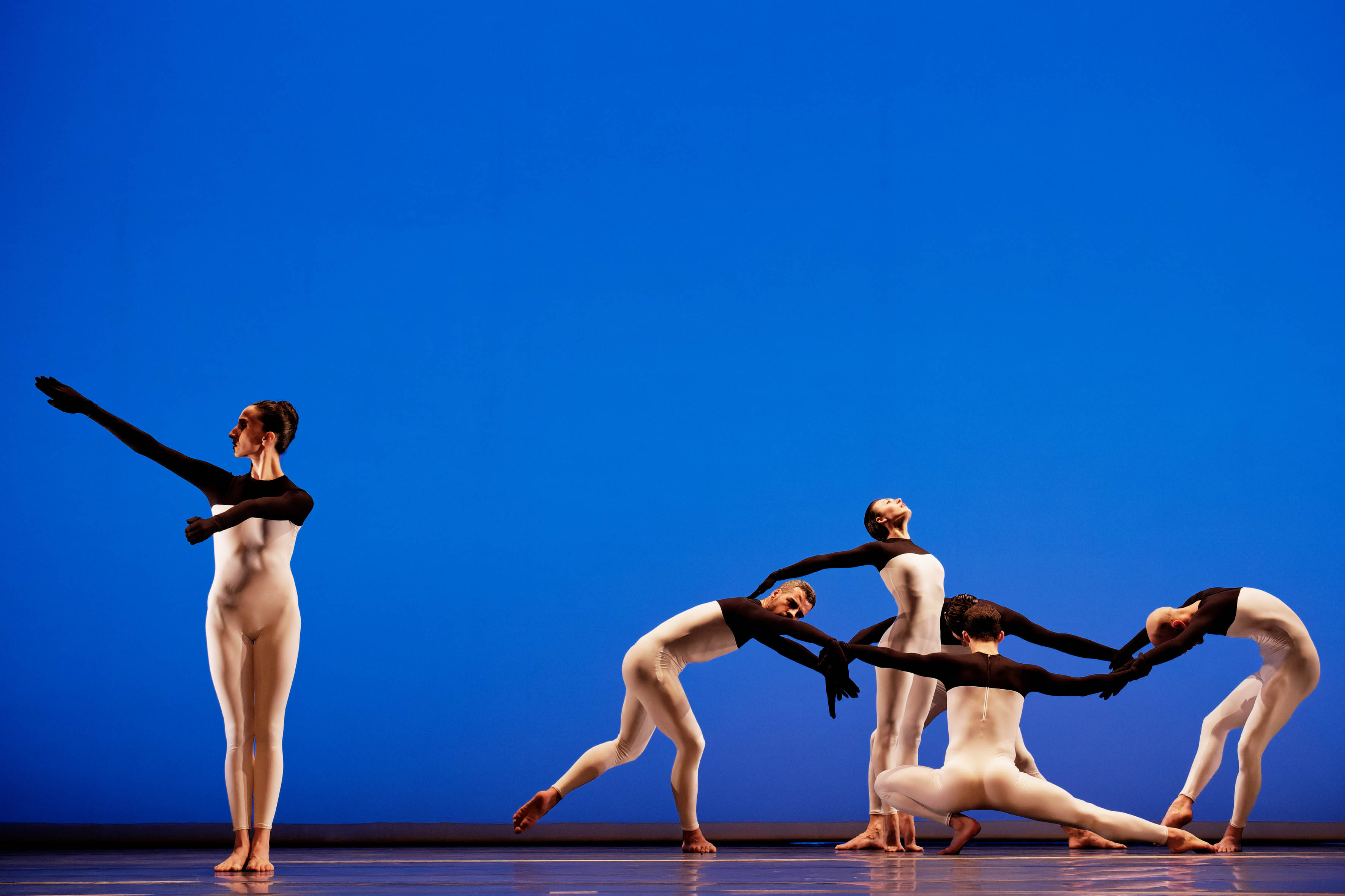 Astrazioni e geometrie animate di linee, forme, sfere e ideogrammi che fluttuano proiettati sullo schermo trasparente di tulle a tutta scena, sembrano immergere i danzatori – con costumi riflettenti essi appaiono e scompaiono dai lati e dal fondo -, dentro un mondo cosmico, dove i movimenti elastici e complessi di braccia, gambe e busto, creano frasi coreografiche, eleganti configurazioni e dinamiche interazioni con le immagini.