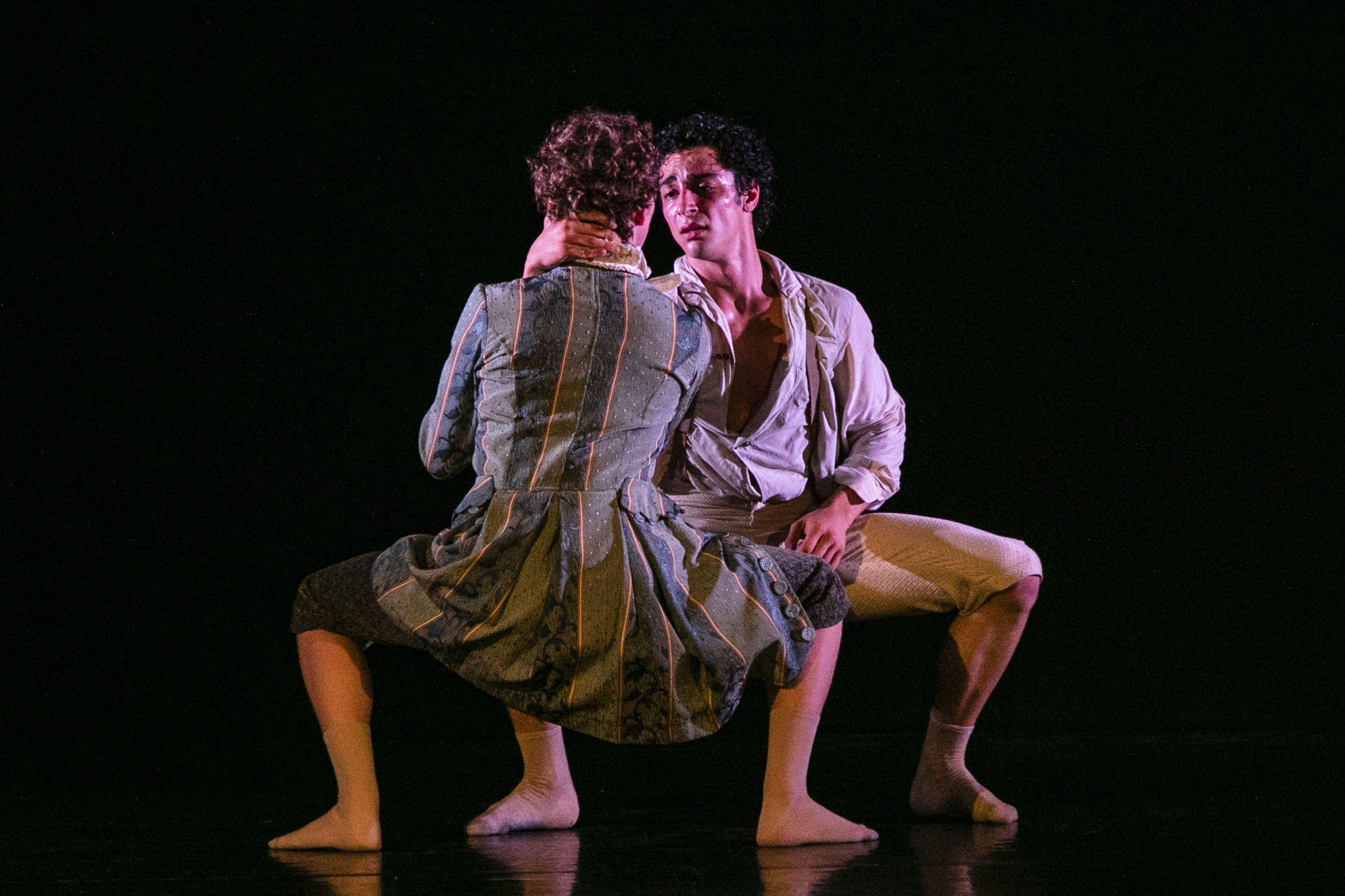 Ed è così che Farinelli rifulge per la capacità di Frola di saper fondere le sue componenti drammaturgiche, coreografiche, musicali (l’universo barocco), facendole risuonare l’uno nell’altro con una imprescindibile corrispondenza espressiva ed emozionale. Nell’intreccio relazionale dei sei personaggi in scena (Antonio Bresolin, Lisa Malaguti, Andrea Cheldi, Zarah Frola, Ester Papini, Ginevra Lenti), Frola insegue una “verità” dei sentimenti che li legano, con al centro il conflitto umano e artistico del cantante lirico, diviso nel rapporto col fratello (il compositore Riccardo Broschi), la loro interazione con le donne, tra passioni, complicità e rivalità, desiderio e sacrificio, successo e fragilità. Essenziali costumi d’epoca, nobili fogge e mantelli, vestono la danza di duetti e terzetti, di amoreggiamenti a terra, di coppie specchianti e assoli sotto lo sguardo altrui. Una danza dinamica, poetica, carica di tensione, che nel duetto d’addio di Farinelli col fratello (i bravissimi Antonio Bresolin e Andrea Cheldi), tra gesti supplichevoli, avvinghiati, rabbiosi, diventa struggente.