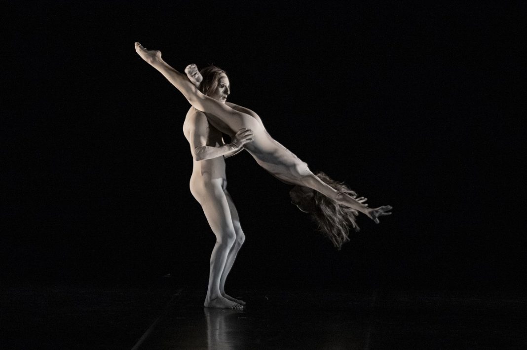 Rappresenta un’autentica rarità la consegna da parte della coreografa di questa sua breve opera alla Contemporary Dance Company di Merola, riconoscendo l’alta qualità della versatile compagnia di Reggio Emilia e degli interpreti chiamati ad eseguire la coreografia (rimontata per l’occasione da due danzatori storici di Marin, Cathy Polo ed Ennio Sammarco). L’armonia, la simbiosi, il rigore esecutivo e l’ardua prova fisica tra Emiliana Campo e Nicola Stasi – visti al debutto a Trento – lasciano senza fiato, bravissimi nell’immergerci dentro un mondo primordiale evocato solo dalla danza muscolare dei loro corpi nudi, velati da un costume color carne, col viso mascherato e una lunga chioma.
