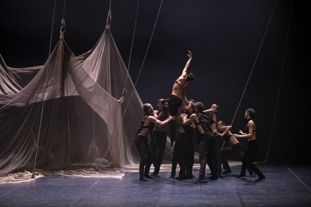 In questa collocazione d’ambiente la coreografia – qualche messa a punto alla drammaturgia dei movimenti arricchirebbe un certo andamento lineare a favore di una maggiore incisività – segue un andamento di flussi e riflussi: con scene corali spezzate e all’unisono, assoli, duetti e quartetti nel comporsi di slanci, di gesti morbidi, ampi, fluidi, rotti da linee nette e prese concitate, per giungere alla gioiosa sequenza finale dopo la tempesta, col gruppo illuminato in penombra, riunito all’interno della tenda, che alza lo sguardo in alto verso il Creatore.