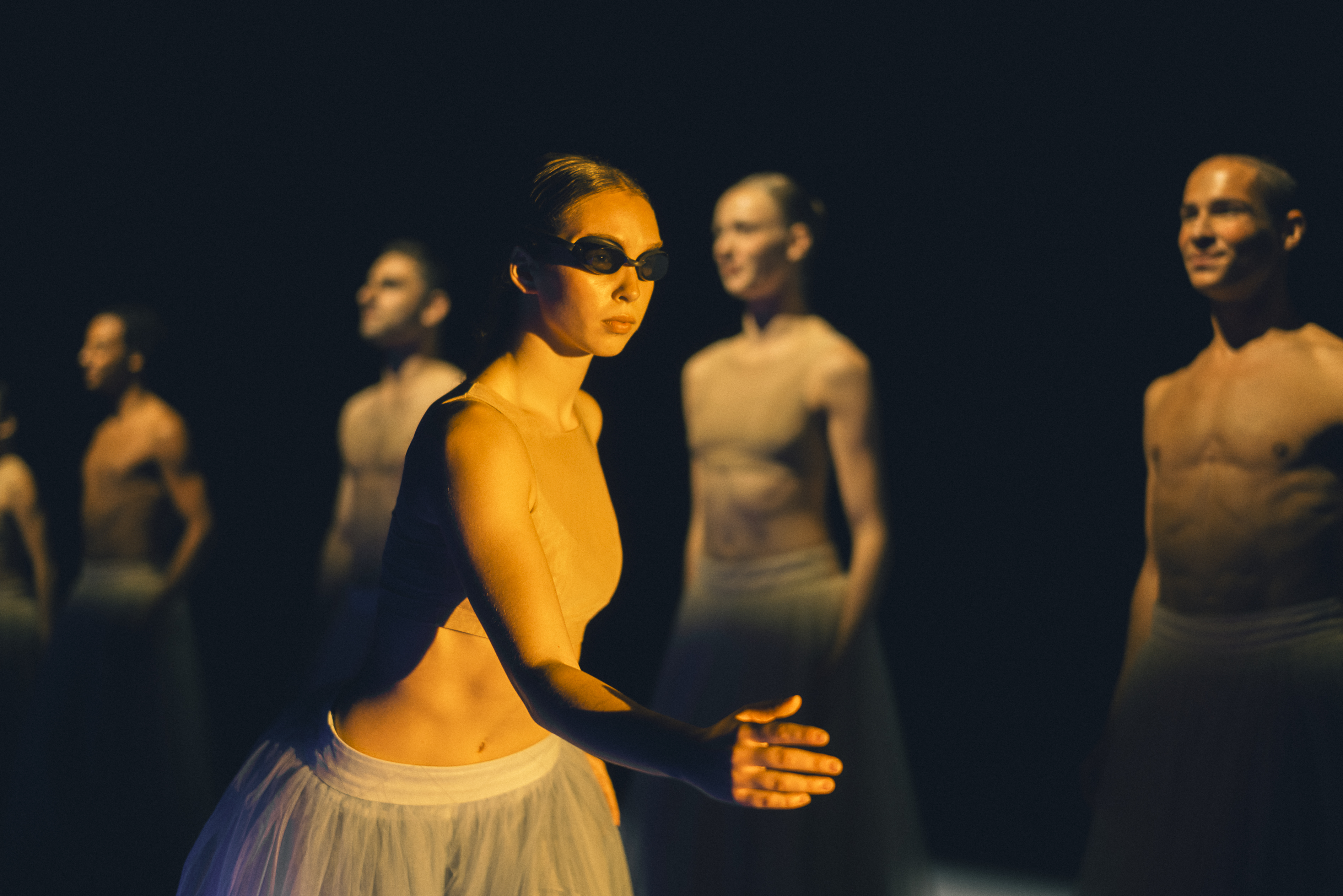 Le spiritose relazioni si intrecciano tra saltelli, litigi, vocii, elogi reciproci, competitività, scandite da sonorità jazz ed elettroniche, con inserti surreali: come la figura in costume e occhialini da nuoto che attraversa il proscenio, o un’altra che introduce un secchio della spazzatura ficcandovi dentro la testa, mentre dietro, disposti in fila, tutti si disarticolano con smorfie e atteggiamenti bizzarri, cercando attenzione. Quelle individualità infine cedono il posto all’uniformità. Svestendosi e rimanendo seminudi, ritrovano un’immagine che li accomuna.