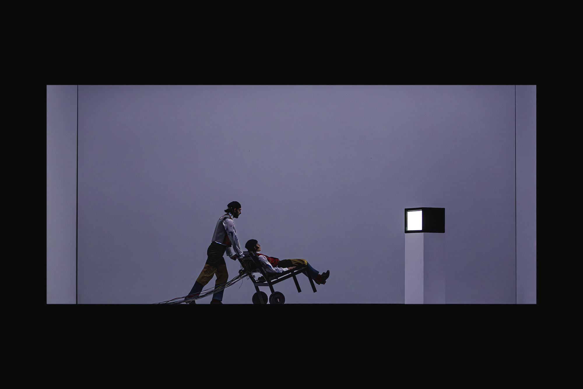 In Firmamento siamo dentro un laboratorio di sperimentazione. Sulla destra una porta e un’insegna con la scritta Exit. Attorno ad una articolata macchina tecnologica un gruppo di “lavoratori della mente umana” che parlano un mix di lingue orientali (di vaghe fogge cinesi anche i costumi), sono intenti ad elaborare un casco particolare a un “ragazzo” – un danzatore arrivato dalla platea con zainetto in spalla – che gli permetta di sognare e creare altri mondi. Appena indossato, guardando un film si lascia coinvolgere da ciò che vede. Come in una scatola cinese si intrecciano, via via, diversi piani narrativi e visivi nella mobilità dell’ingegnoso impianto scenografico firmato da Max Glaenzel. Svanito ogni oggetto e arredo, una parete indietreggerà aprendosi dalla semioscurità allo spazio luminosissimo di una grande stanza asettica, poi colorata. Qui il giovane, varcando i confini della realtà e della mente, si ritroverà in un mondo parallelo vedendo sé stesso in un ipotetico futuro con lo scorrere di disegni animati in bianco e nero che ripercorrono la sua vita, e l’apparizione degli altri danzatori, poi di un omone mascherato, un televisore, una sfilza di sedie, un letto bianco, un pinguino e un massiccio inuit (scoprendo che il termine della popolazione artica significa “umanità”, ci fa pensare all’ultimo essere vivente portatore di un barlume di vita).