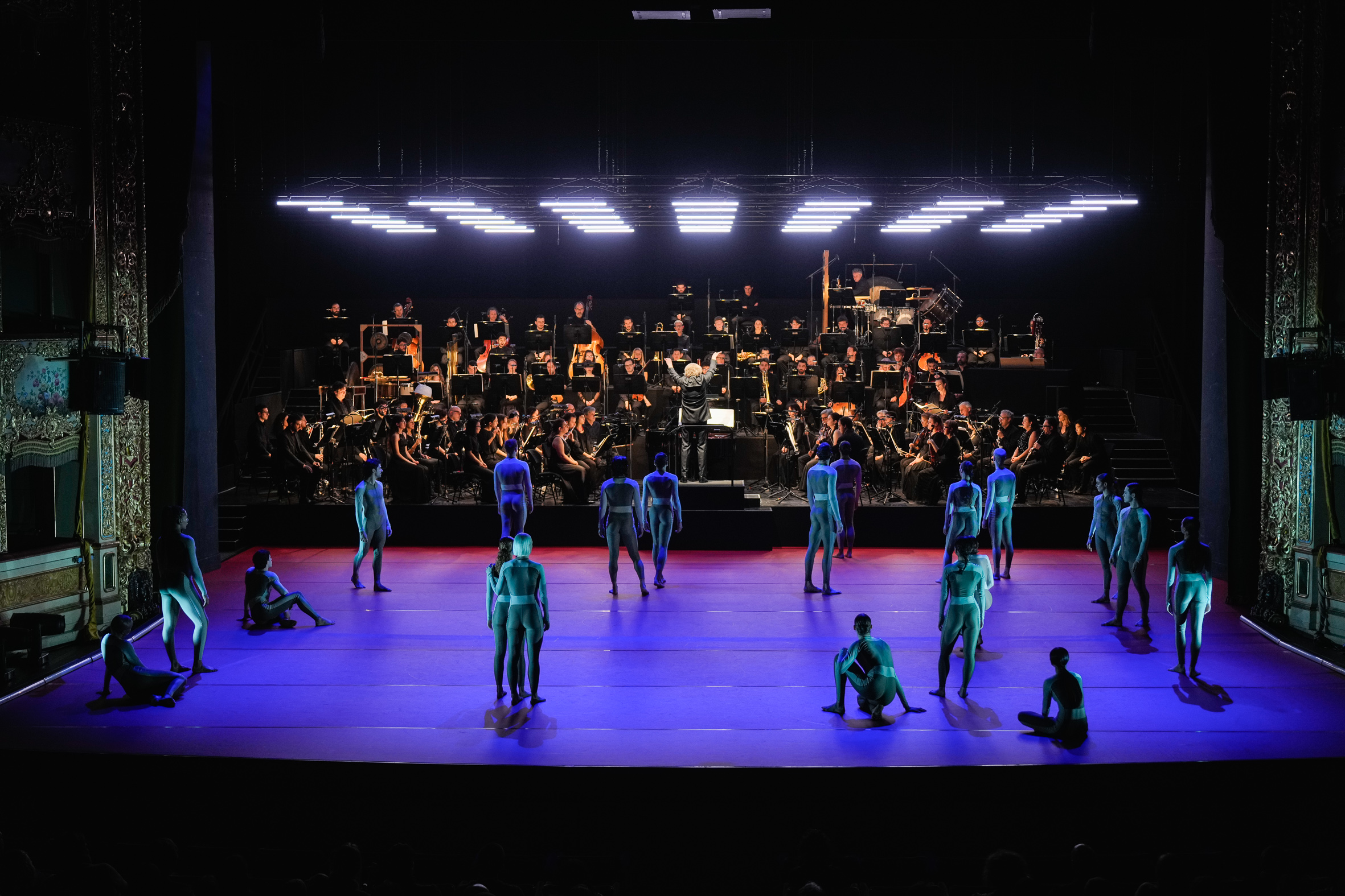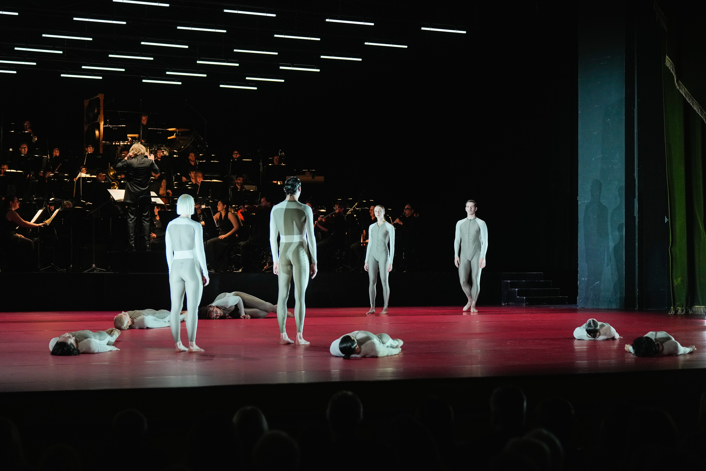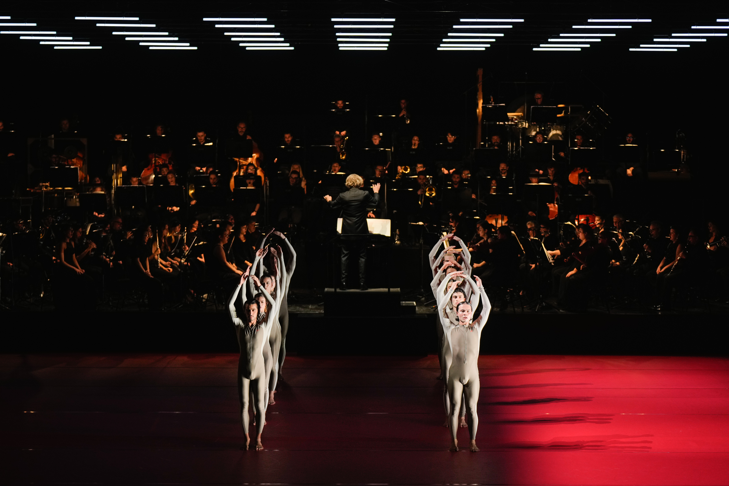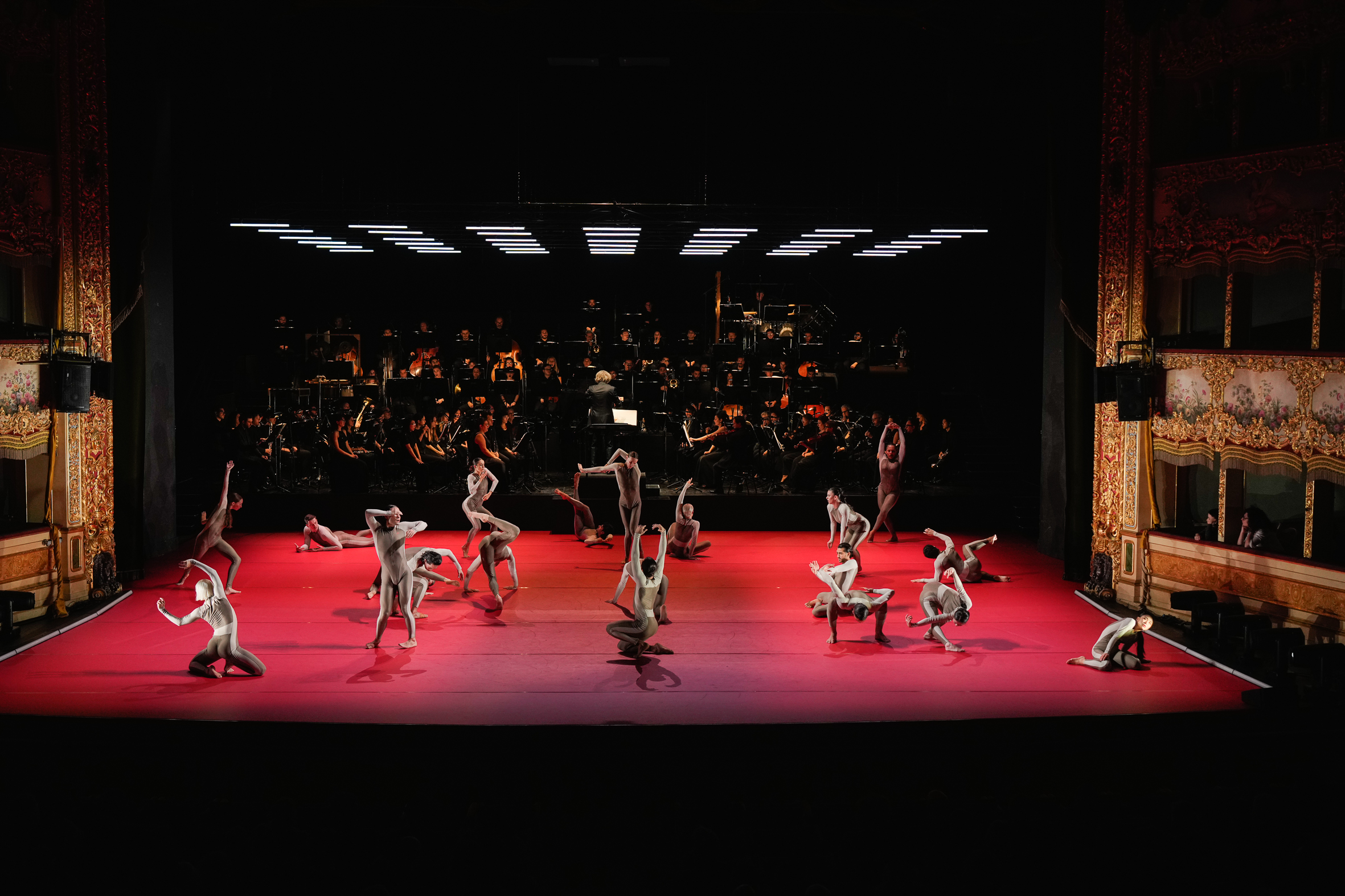 Opera contemporanea, senza tempo, di ieri e di oggi, Coro è un mix potente di espressioni musicali, di voci e danza, di ritmi, sonorità e movimenti che si espandono, si dissolvono, rientrano e vanno in profondità. Visivamente, un mosaico umano, una parete vibrante di corpi e note. In una scena illuminata in alto da finestrelle led, dal variare di luci prevalentemente rosse sul palcoscenico prolungato sulla buca orchestrale, 20 danzatori della Company Wayne McGregor, un ensemble di 40 strumentisti – dell’Orchestra del Teatro La Fenice -, di altrettante voci soliste – del Coro della Cattedrale di Siena “Guido Chigi Saracini” – distribuiti in mezzo agli orchestrali e amalgamati insieme sul fondo della scena, hanno dato vita ad un vero e proprio evento teatrale nel segno della sperimentazione: quella di Coro di Luciano Berio, un’originale scrittura orchestrale e corale sulla quale Wayne McGregor, direttore della Biennale Danza, ha costruito una superba partitura coreografica coi corpi di dieci danzatori della sua compagnia londinese, e dieci giovani allievi usciti dall’ultimo quadriennio della Biennale College.