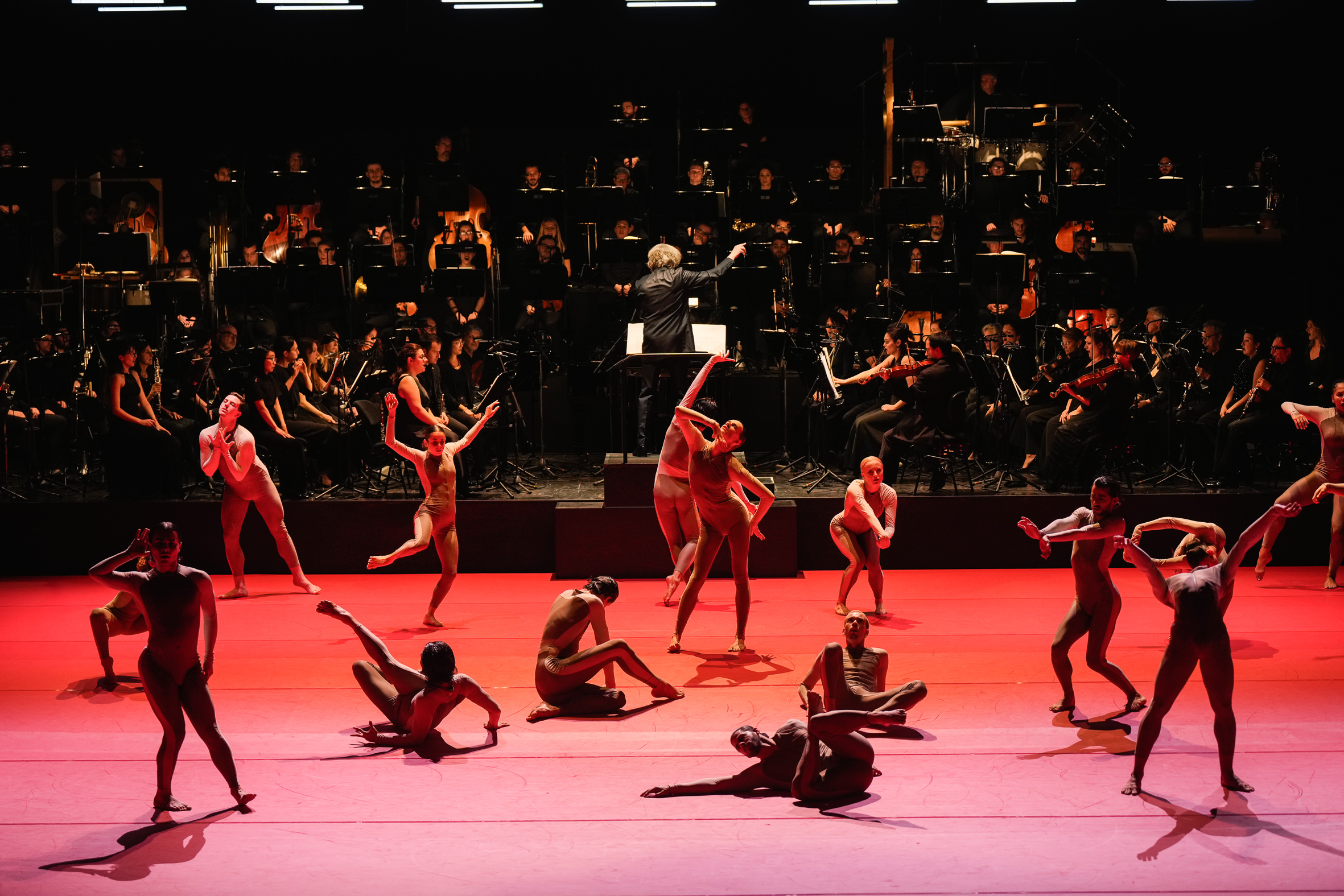 Opera contemporanea, senza tempo, di ieri e di oggi, Coro è un mix potente di espressioni musicali, di voci e danza, di ritmi, sonorità e movimenti che si espandono, si dissolvono, rientrano e vanno in profondità. Visivamente, un mosaico umano, una parete vibrante di corpi e note. In una scena illuminata in alto da finestrelle led, dal variare di luci prevalentemente rosse sul palcoscenico prolungato sulla buca orchestrale, 20 danzatori della Company Wayne McGregor, un ensemble di 40 strumentisti – dell’Orchestra del Teatro La Fenice -, di altrettante voci soliste – del Coro della Cattedrale di Siena “Guido Chigi Saracini” – distribuiti in mezzo agli orchestrali e amalgamati insieme sul fondo della scena, hanno dato vita ad un vero e proprio evento teatrale nel segno della sperimentazione: quella di Coro di Luciano Berio, un’originale scrittura orchestrale e corale sulla quale Wayne McGregor, direttore della Biennale Danza, ha costruito una superba partitura coreografica coi corpi di dieci danzatori della sua compagnia londinese, e dieci giovani allievi usciti dall’ultimo quadriennio della Biennale College.