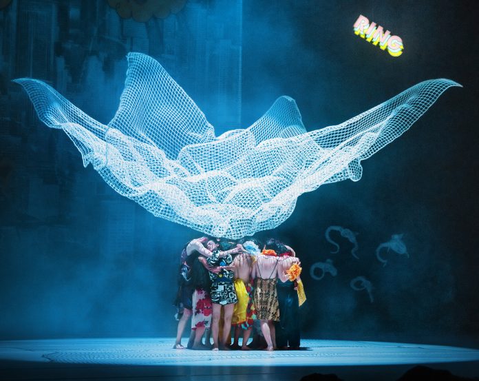 Contenuti dentro un set scenografico pop con due pareti fotografiche in bianco e nero di grattacieli e disegni colorati – una siringa piantata nel cuore, pecore gialle, la scritta Ring, e altro -, i tre lavori sono legati tra loro, nel breve intervallo che li separa, da una musica techno debordante, una grande discoteca da girone dantesco dei nostri tempi, che introduce alle sequenze successive. Li accomuna, anche, una parte dei costumi indossati dai danzatori che entrano incappucciati con dei mantelli neri da monaci medievali, e mascherati con delle teste d’ariete che toglieranno e rimetteranno in più momenti.