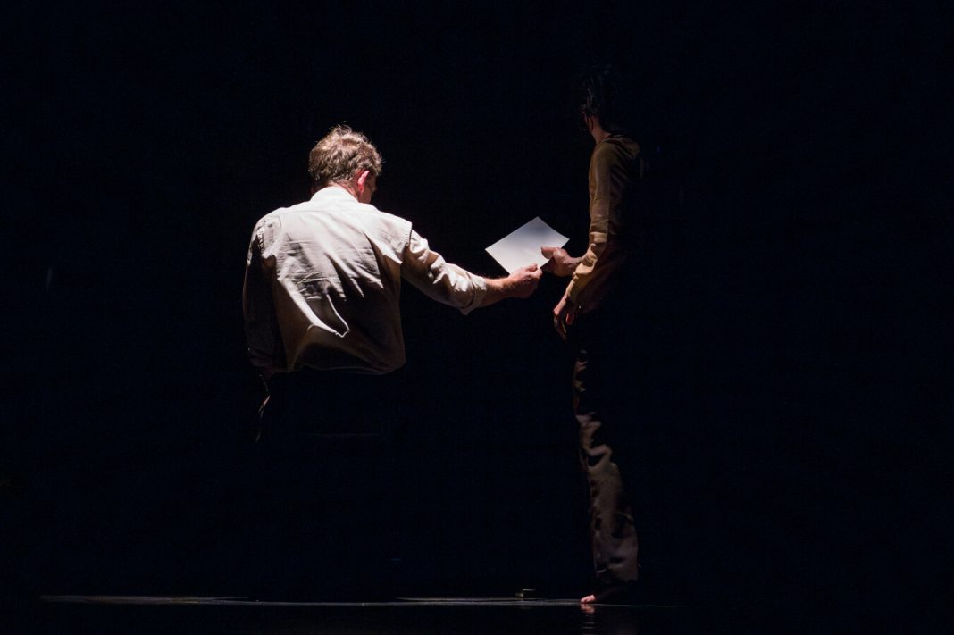 I due giovani danzatori Roberta Piazza e Andrea Rizzo – intensi ed espressivi nel calarsi nei ruoli -, sono la coppia tiene in ostaggio Moro nel covo, questi impersonato dallo stesso Padovani posizionato, con bella intuizione, sul fondo della scena, figura minuta e silenziosa ma fortemente presente, che per tutto il tempo della rappresentazione rimane in penombra, seduto di spalle su uno sgabello, salvo muoversi in due brevi momenti. Il secondo di questi è portatore di un gesto struggente, quasi di pietà verso i suoi aguzzini: si avvicina a loro nel sonno, li guarda amorevolmente, e stende la mano (una semplice postura plastica che sembra scaturire da un affresco pittorico), come a perdonarli per il gesto assassino che da lì a poco lo attende.