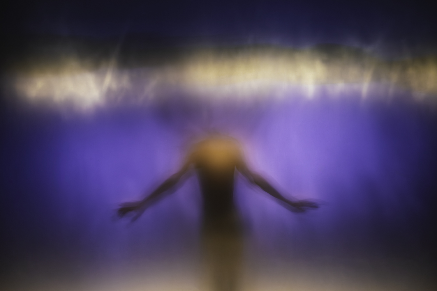 C’è una sfocatura dei corpi in quel grande tulle che copre l’intero proscenio, maculato da schegge luminose intermittenti e da vampate di colori – prima giallo, poi rosso – che esplodono e subito si diradano. C’è un balletto di ombre evanescenti che avanzano e indietreggiano lentamente fino a scomparire e ritornare nel loro procedere a tentoni, lasciando sul telo bianco tracce di mani, di braccia, di schiene, di volti, e di oggetti – un tavolo, un trolley, delle forbici, una radiolina, occhiali scuri -, che subito si dissolvono alla nostra vista. A loro, ai danzatori dei quali scorgiamo appena le sagome dietro quello schermo opalescente, è stata tolta.