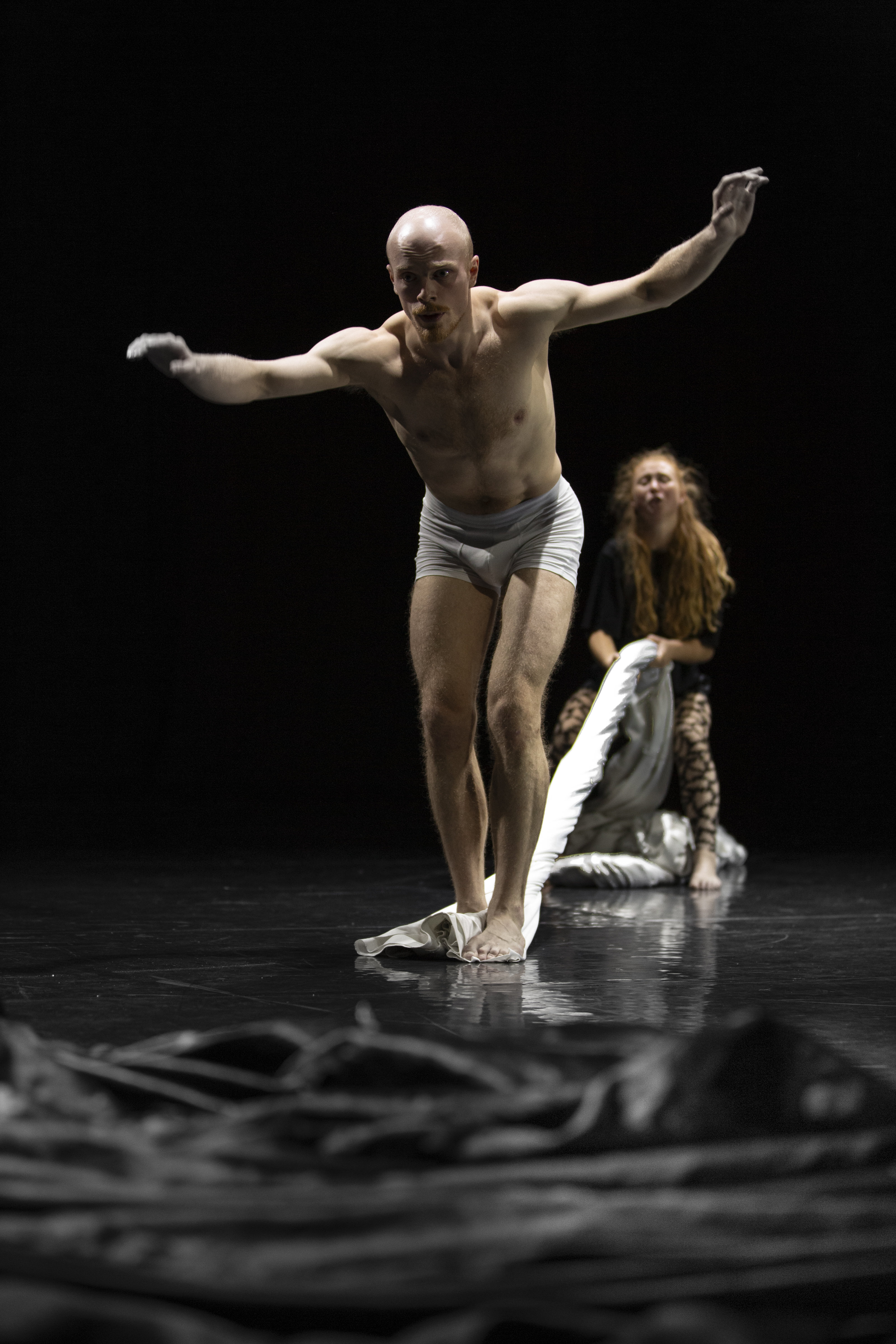 Il senso è da cercare, forse, nell’unica sequenza all’unisono, dell’ultima scena che chiude lo spettacolo, anticipata dalla intensa danza corale – di Iona Kewney, Lotta Sandborgh, Cola Ho Lok Yee, Paola Taddeo, Adrian Thömmes, Hakim Abdou Mlanao – ispirata a un ballo georgiano con le braccia che si muovono nascondendo il volto: un sottrarsi allo sguardo suggellato dall’enorme tendaggio scuro calato velocemente sulla scena, che avvolge i danzatori sottraendoli alla nostra vista; e risalendo, come un’improvvisa implosione, lascia vuoto il palcoscenico.