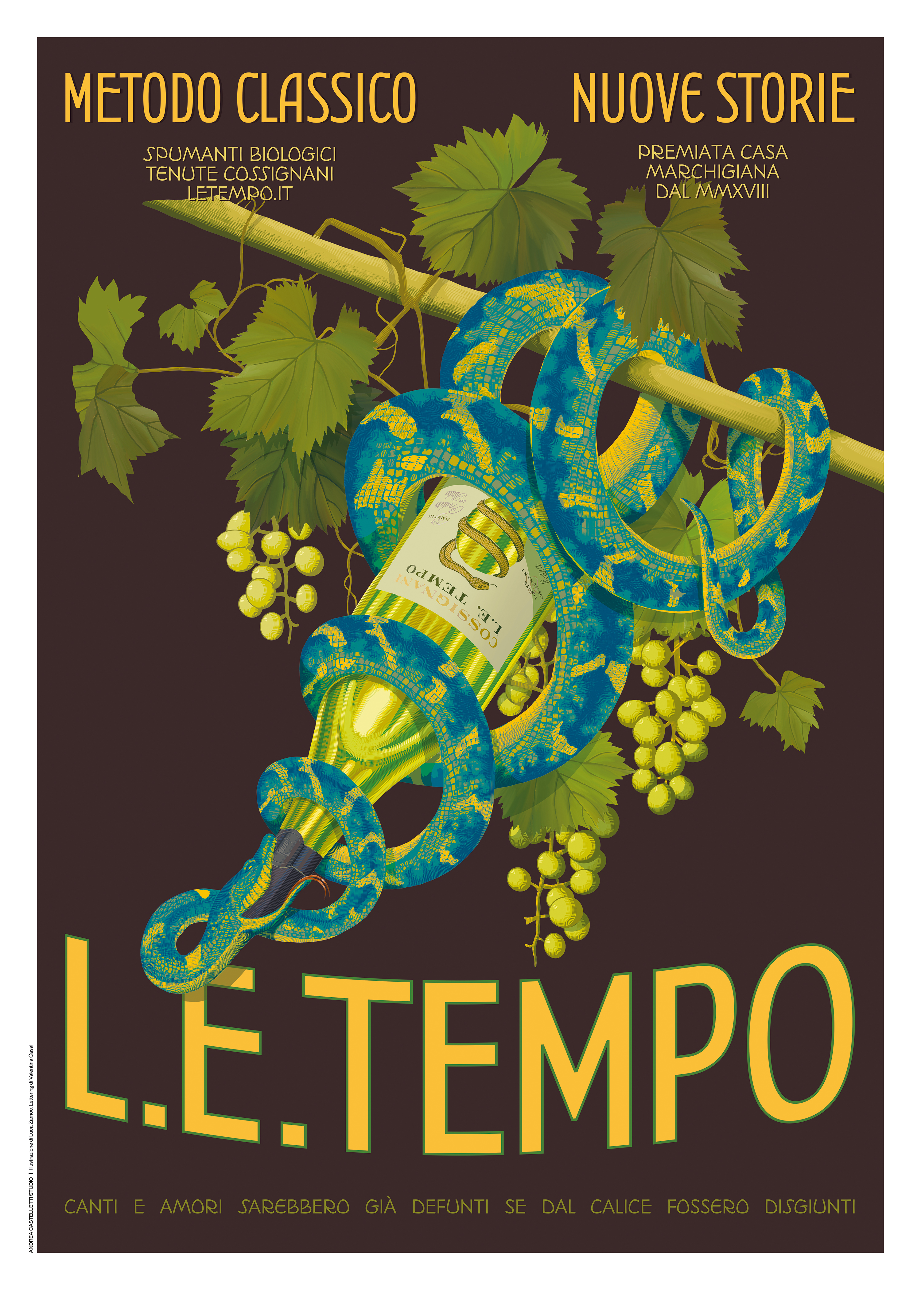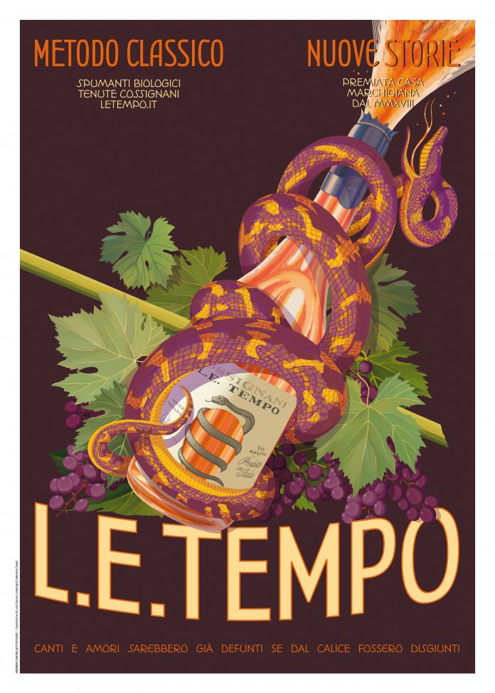 È utile, in questo caso, spiegare il progetto creativo che ha portato alla realizzazione delle due versioni dei poster con le parole dell’artista, che dichiara: «Sono partito come spesso faccio da uno schizzo realizzato a mano, ma la finalizzazione è avvenuta in digitale. Per scelta, proprio come uno statement, perché questa è un’opera dentro al suo tempo. Di questo tempo doveva avere e ho voluto che avesse, estetica e tecnica, insieme. L’idea di questo serpente, un secondo serpente, che gode di avere tra le sue spire la bottiglia, mi piaceva e mentre riflettevo ho ricordato mio nonno e un suo racconto. Giovane emigrò in Argentina e, arrivato lì, i suoi amici che aveva raggiunto lo portarono nella pampa. Qui vide, con stupore, un serpente che si era avvolto alla gamba di una mucca e raggiunta la mammella ne beveva il latte. I serpenti, lui non lo sapeva ancora, sono ghiotti di latte e le mucche lasciavano fare perché le liberava del latte in eccesso. Nella scelta di impegnarsi nell’azienda di famiglia compiuta da Letizia e Edoardo, centrale è stata la figura del loro nonno Saturnino. Ho pensato che dovessi dar corso a queste suggestioni, tenendomi lontano dall’iconografia del serpente che avverte di un pericolo e reinventandolo in un’attitudine gioiosa, gaudente, libera».