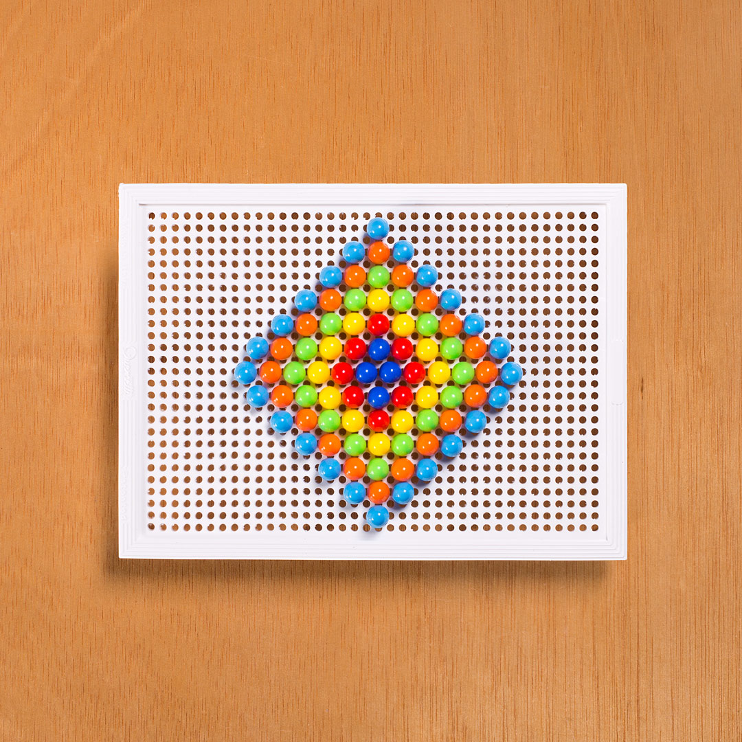 Chiodini in plastica colorata per composizioni su tavoletta traforata, Quercetti, Torino, dal 1953
