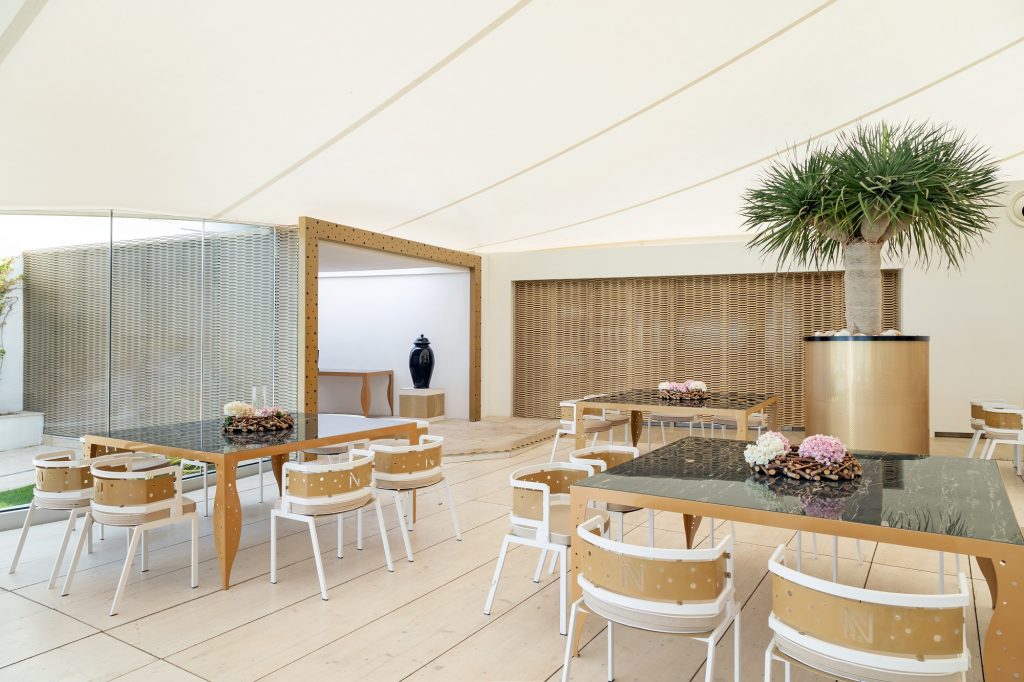 Ciò che Eugenio Tibaldi ha cercato con la sua Shell del Nabilah è quindi «una sensazione di contatto con il mare e con la rocca romana in una sorta di sospensione temporale e stilistica». E, infatti, anche lo spiazzante arredamento, che mescola il modernismo geometrizzante delle sedie e il moderno impero rivisitato dei tavoli, entrambi smorzati (e rinnegati) da un traforo a pois, è stato disegnato da Tibaldi, che ha ipotizzato per quegli oggetti un’estetica futuribile e mai avverata.