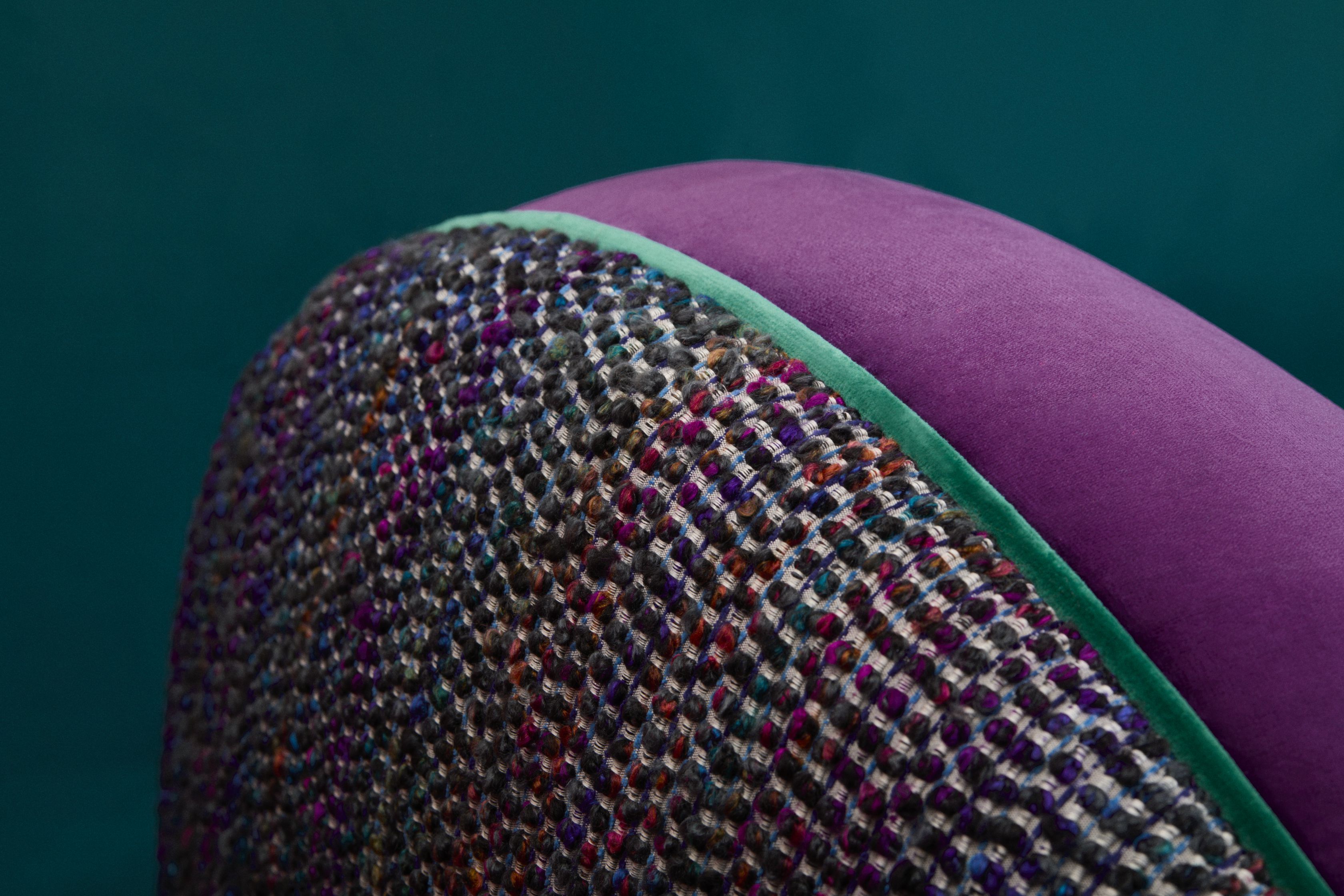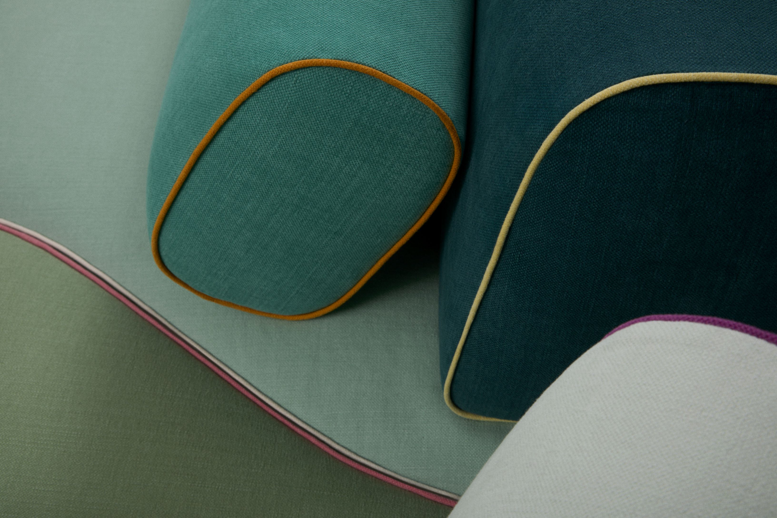 Entrano in circolo materialità diverse: tessuti morbidi, come i velluti, altri più rigidi e strutturali; cuciture a contrasto e a scomparsa; colorazioni complementari associate nella leggerezza di composizioni intercambiabili. Oggetti come la poltrona TiAmo vengono riproposti in configurazioni differenti, marcando un processo modulare che è presente nell’intera collezione. Il materiale, pienamente in linea con la sensibilità del nostro tempo. Nella versione indoor, il velluto è associato ad un intrigo materico di bouclé misto cotone e lana e il rivestimento interno è una gommapiuma ecosostenibile; l’outdoor è caratterizzati da un tessuto tecnico idrorepellente e una gommapiuma tecnica.