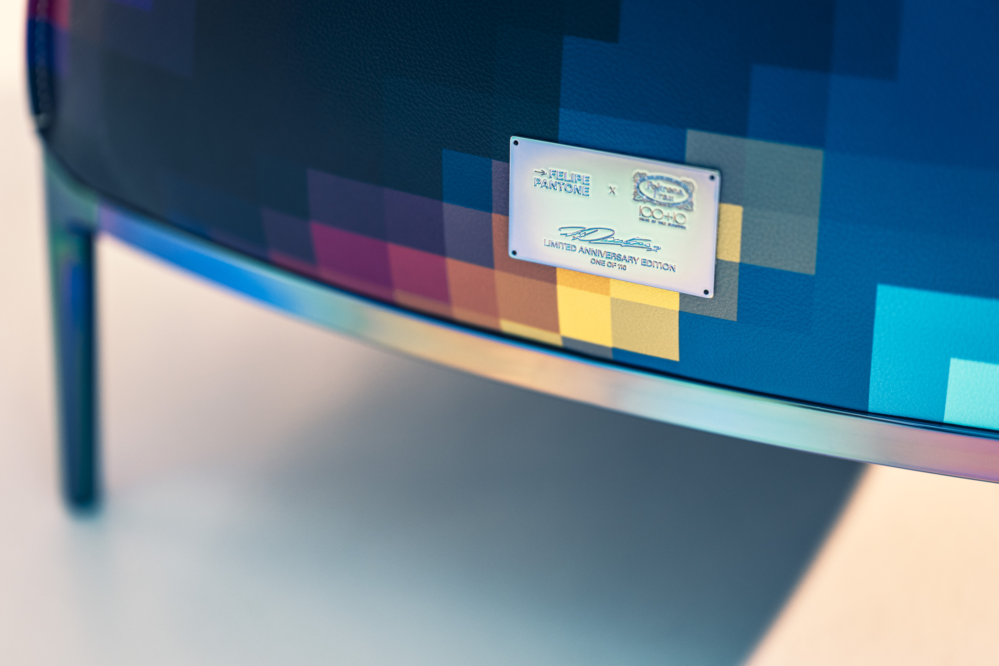 Utilizzando come ispirazione la palette della ColorSphere di Poltrona Frau, Pantone ha creato una texture vibrante sulle superfici in pelle della Archibald, una griglia sfumata di rossi, arancioni, gialli, bianchi e blu, che ricordano le gradazioni delle temperature in una mappa di calore. La base e le parti in metallo delle caratteristiche gambe sottili sono verniciate in Multicolor Chrome, con sfumature iridescenti e cangianti.