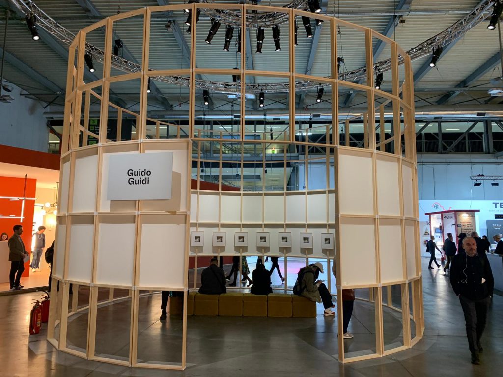 La scelta di questa nuova edizione di Euroluce e del Salone del Mobile è stata di segno opposto: un nuovo masterplan della circolazione e dei padiglioni immaginato da Lombardini 22 e un sistema diffuso e variabile di installazioni e micro spazi per la cultura del progetto che avessero un carattere facilmente riconoscibile. Il caso meglio riuscito è quello delle dodici “Costellazioni” curate da Beppe Finessi e allestite da Formafantasma, che stanno sempre più dimostrandosi progettisti di allestimenti eleganti e insieme asciutti nella loro chiara elementarità. Dodici moduli giocati quasi sempre per inserti di tre mezze curve intrecciate tra di loro per ospitare altrettanti autori e autrici, giocate con altezze variabili ma sempre modulari.