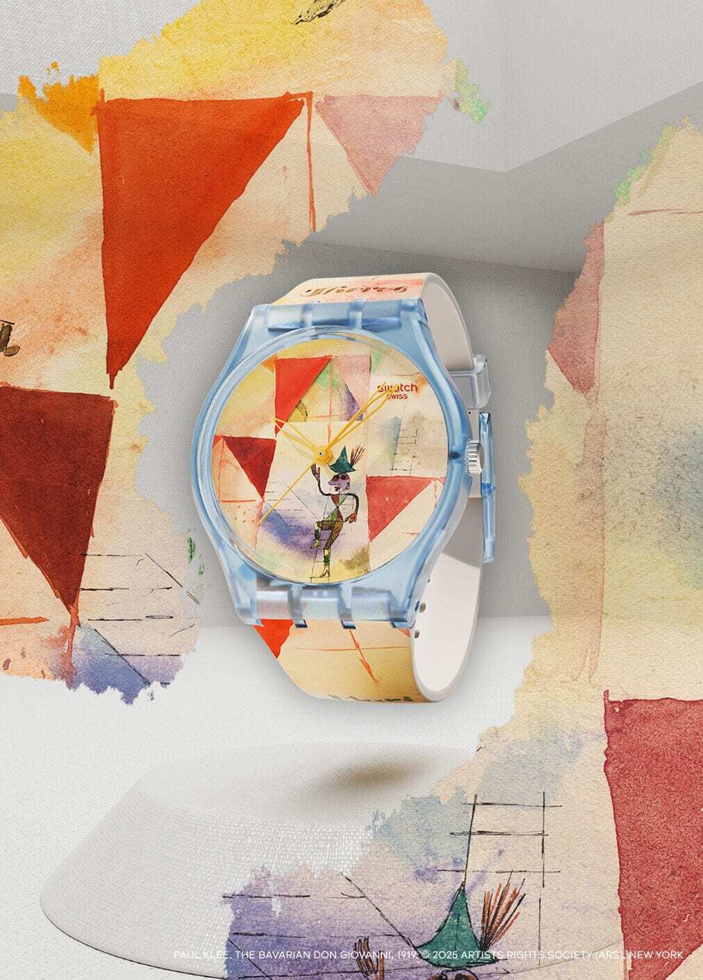 Con Degas’s Dancers, ispirato alle Ballerine in Verde e Giallo del 1903, Swatch rielabora l’attenzione di Degas per il corpo e il movimento. Le cromie accese e il ritmo visivo del quadrante alludono alla tensione coreografica delle ballerine. Klee’s Bavarian Don Giovanni nasce invece dall’opera Don Giovanna bavarese (1919) e traduce la grammatica simbolica e ludica di Paul Klee in un gioco di geometrie e segni. Un elemento distintivo è il disco del datario, che cambia colore ogni giorno, richiamando l’idea dell’arte come processo in continua trasformazione, centrale nella poetica dell’artista.