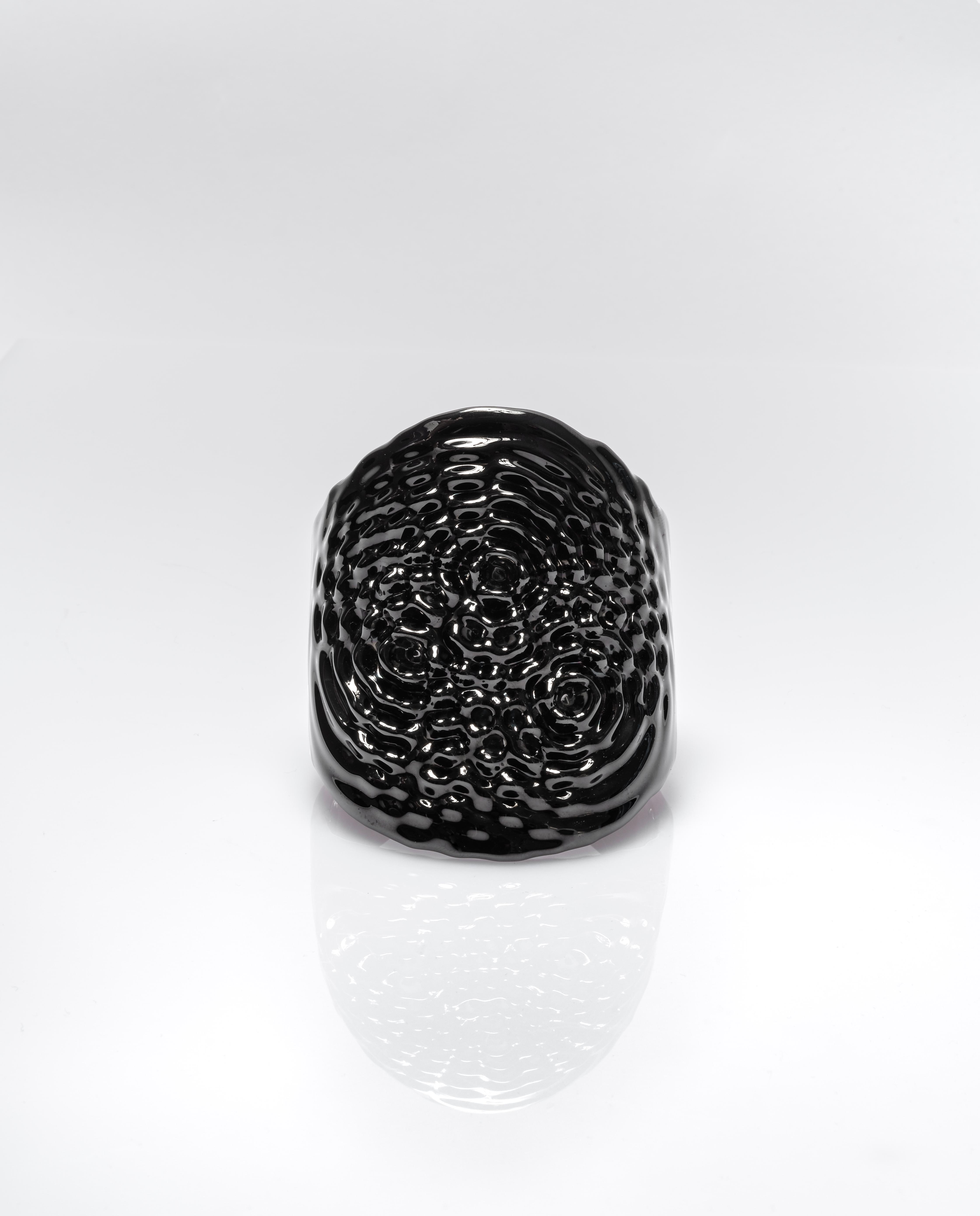 «Il bracciale rigido, realizzato in varie versioni (argento, placcato oro, placcato rutenio e ottone verniciato a polvere) che si caratterizza per superfici segnate da forme acquee, increspature leggere che richiamano i Wall Waves Vibrations. Poi l’anello in argento e in oro e titanio, che riprende lo stesso disegno tridimensionale, ma con una forma più tondeggiante che ricorda un bozzolo, il nido di un insetto. La collana (in versione oro o argento) e gli orecchini (in argento) sono invece germogliazioni dei Waterbones, una serie di lavori prodotti dal 2009 frutto delle osservazioni sulla morfologia di piante e minerali, sui loro sistemi molecolari».