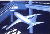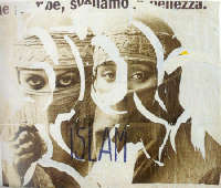 Ricordiamo allora Vuk Cosic, il net-artista che in quel padiglione esponeva il suo progetto Art for the Airport, nel quale recupera l’iconografia classica occidentale attraverso la segnaletica aeroportuale. Il suo “S. Sebastiano” trafitto dalle frecce e la “Pietà”, nella sintesi minimale, si offre oggi ad una lettura che associa alla mistica occidentale del martirio timori e drammi legati alle attese dei viaggiatori.Rotella Mimmo Islam 1999