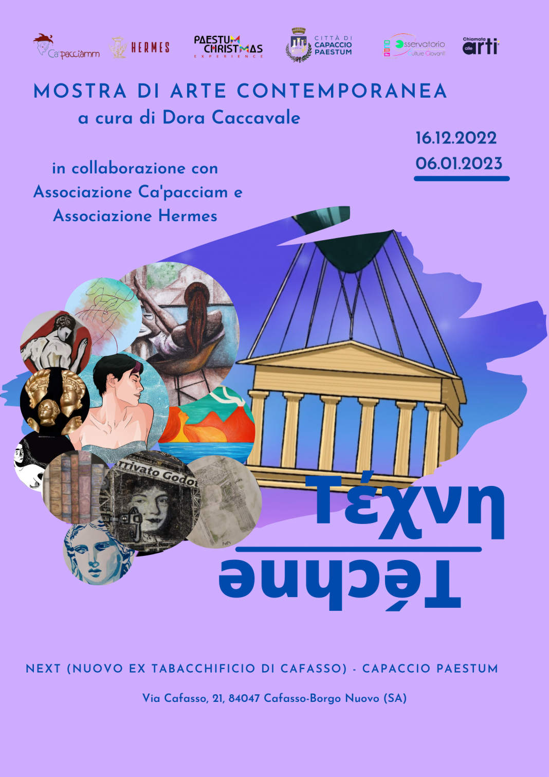 Venerdì 16 dicembre 2022 a Capaccio Paestum alle ore 18, presso NEXT (Nuovo Ex Tabacchificio di Cafasso) in Via Cafasso, 21, sarà inaugurata Τέχνη, la mostra di arte contemporanea curata da Dora Caccavale con la collaborazione dell’Associazione Ca’pacciam e dell’Associazione Hermes.