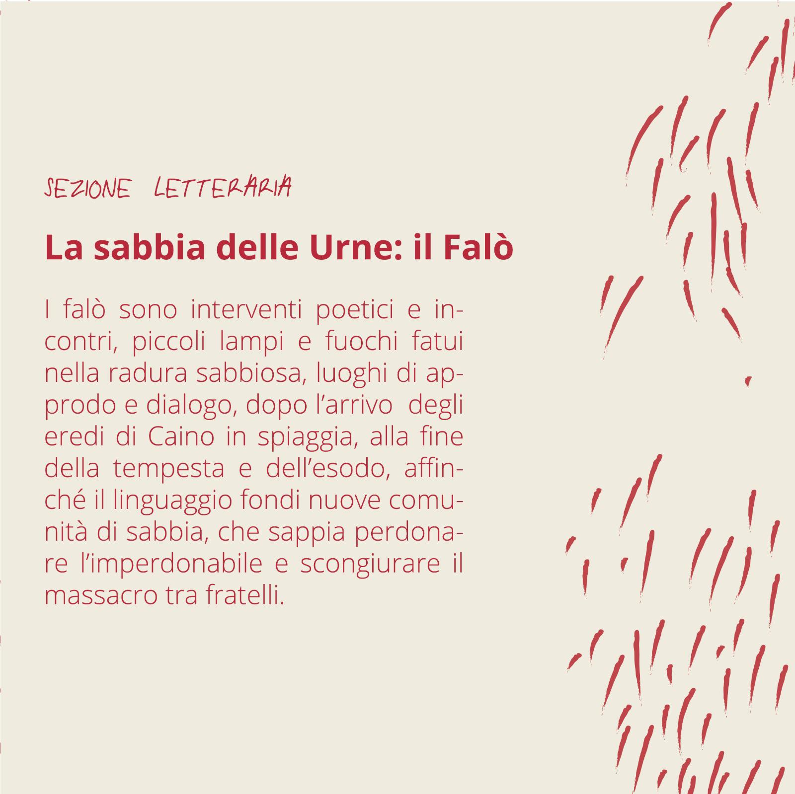 I falò interventi poetici, e incontri, piccoli lampi e fuochi fatui nella radura sabbiosa luoghi di approdo e dialogo dopo l’arrivo degli eredi di Caino in spiaggia, alla fine della tempesta e dell’esodo, affinché il linguaggio fondi nuove comunità di sabbia, che sappia perdonare l’imperdonabile e scongiurare il massacro tra fratelli.