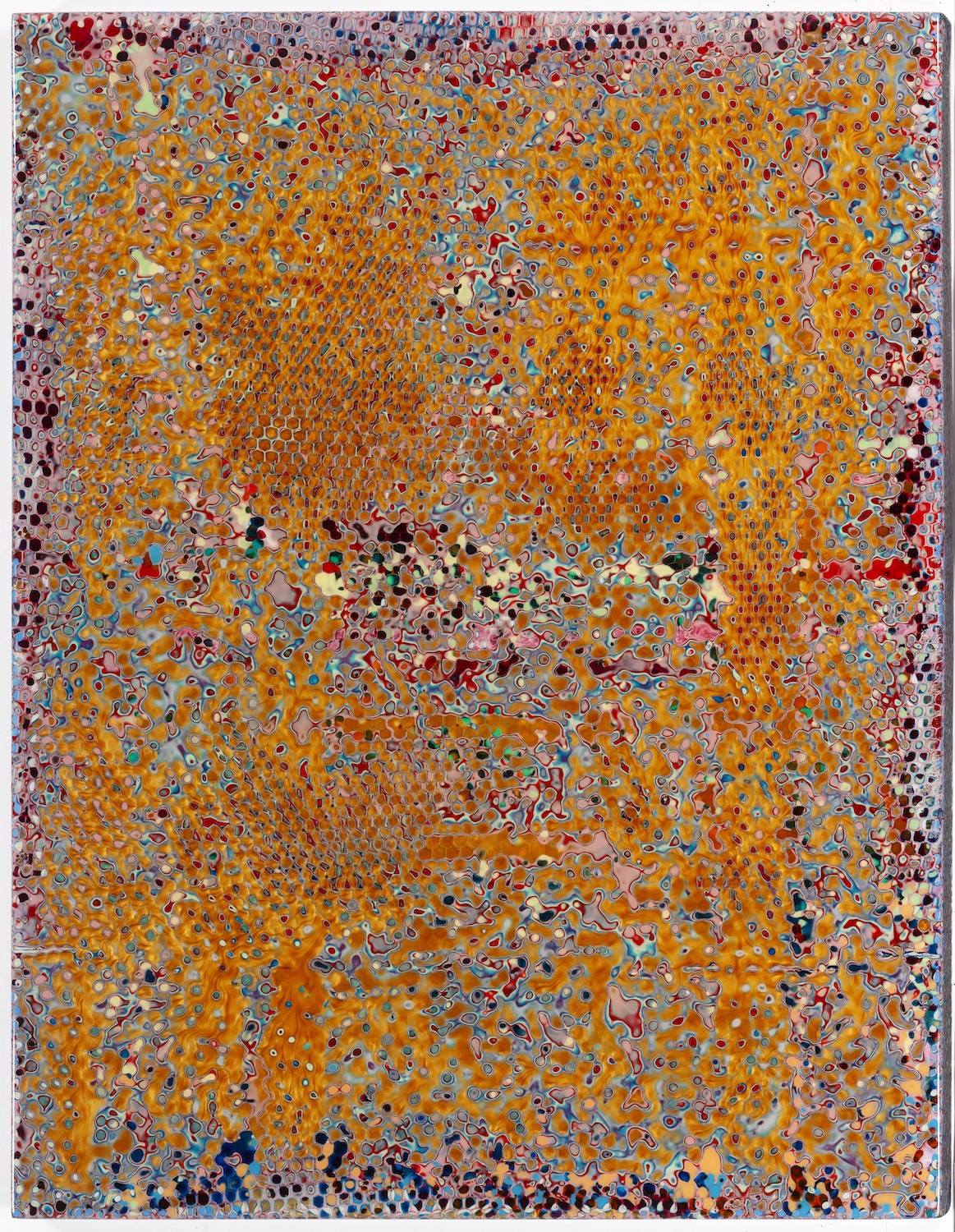 Un lento e continuo lavoro di addizione e sottrazione, che lo armonizza alle sequenze e ai tempi delle filosofie orientali: una sorta di mantra, che si ripete per mesi, anni, consentendo al colore ed alla resina di prendere consistenza, di solidificarsi, per poi venire smerigliati, alternando maggiore o minore levigatura, in modo che in alcuni punti ben precisi, gli elementi materici e simbolici emergano "dall'abisso" ed affiorino in superficie. Ecco apparire un universo di colori, forme, microorganismi, microcosmi di infinite tonalità, che ci consentono di viaggiare con gli occhi, ma anche con l'immaginazione, conducendoci in mondi altri, forse siderali, lontani anni luce, oppure più vicini, presenti dentro ognuno di noi, nel profondo delle nostre visioni oniriche o dei nostri occhi e che Robert Pan riesce a far riemergere.