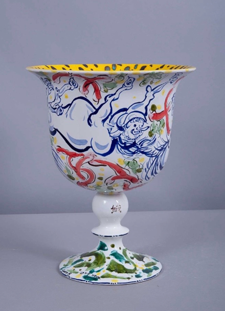 Una tradizione che è tanto materiale – il media ceramico è infatti da millenni fonte di ornamento e sostentamento estetico, alle pendici del Vesuvio, ma non solo – quanto immateriale. Attraverso essenziali giochi di forme e segni, Runo B scherza con lo spettatore, alludendo al celebre piacere dello “stare a tavola e godersela”, tipicamente italiano, se non propriamente napoletano. Tutto ciò, senza rinunciare a confrontarsi con il nostro presente, attraverso la sua personale e particolare sgargiante prospettiva.