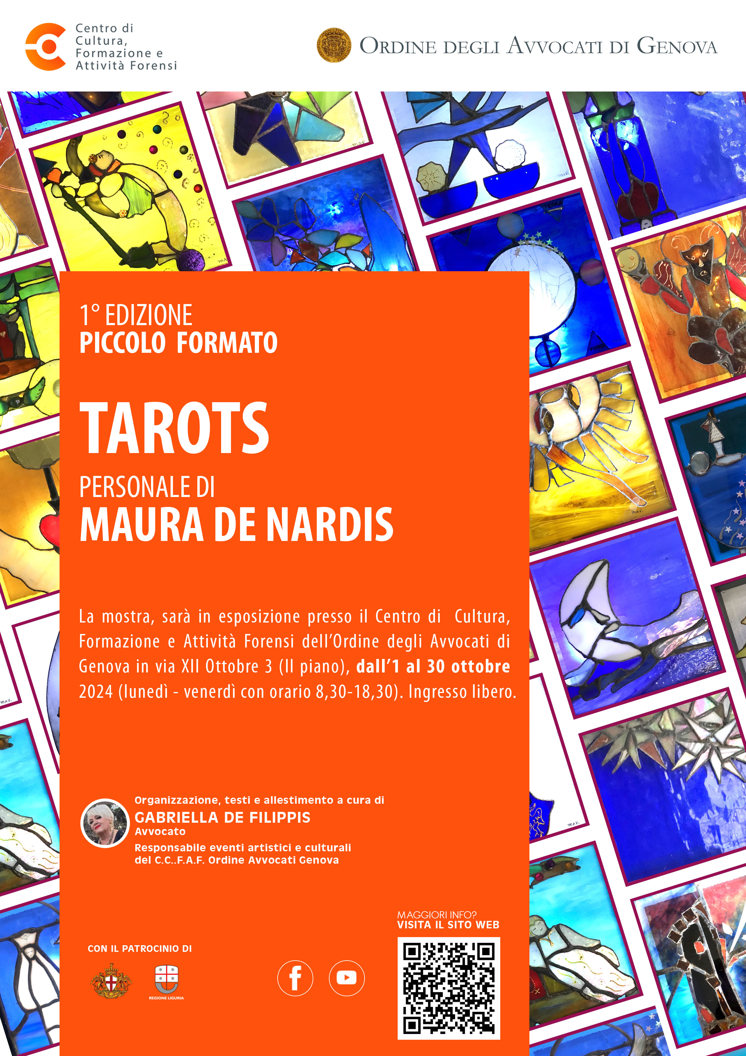 Maura DE NARDIS, diplomata all’Accademia Ligustica di Belle arti di Genova, astrologa oltre che pittrice si dedica da anni alla ricerca dell’approfondimento del mito astrologico riferito all’arte e pertanto ha realizzato, con la tecnica del manufatto Tiffany le 22 tavole degli arcani maggiori dei tarocchi .