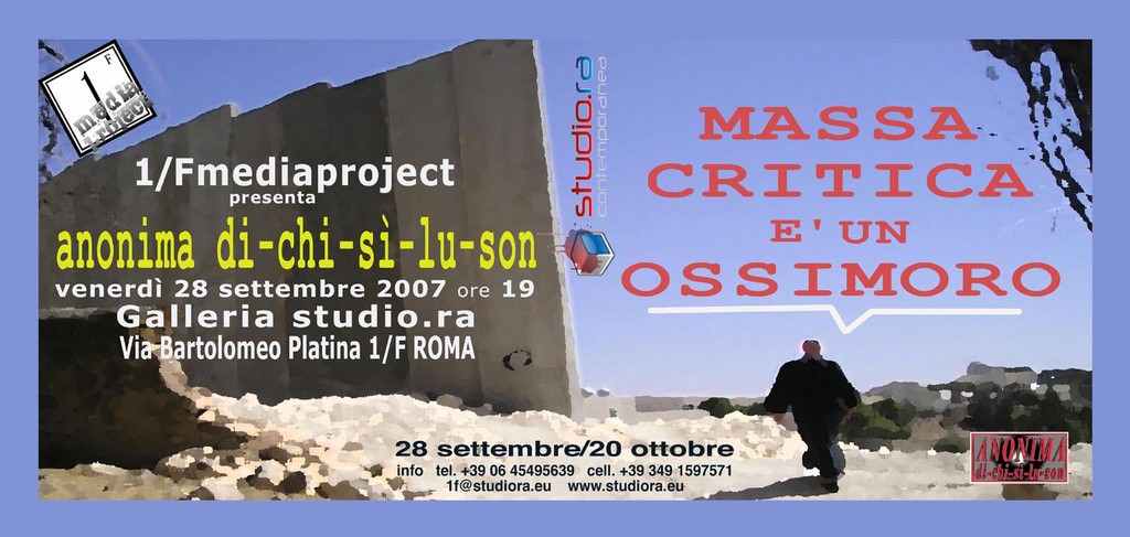«Massa Critica è un Ossimoro», è l’occasione per inaugurare il progetto 1/Fmediaprojet, inserito all’interno delle attività della Galleria studio.ra, il quale si occuperà in maniera sistematica di tutta quell’arte che, partendo da una base teorica riconducibile al Medialismo, si è evoluta nel tempo dando vita ad anonimati, nomi collettivi, gruppi, comunità ecc.