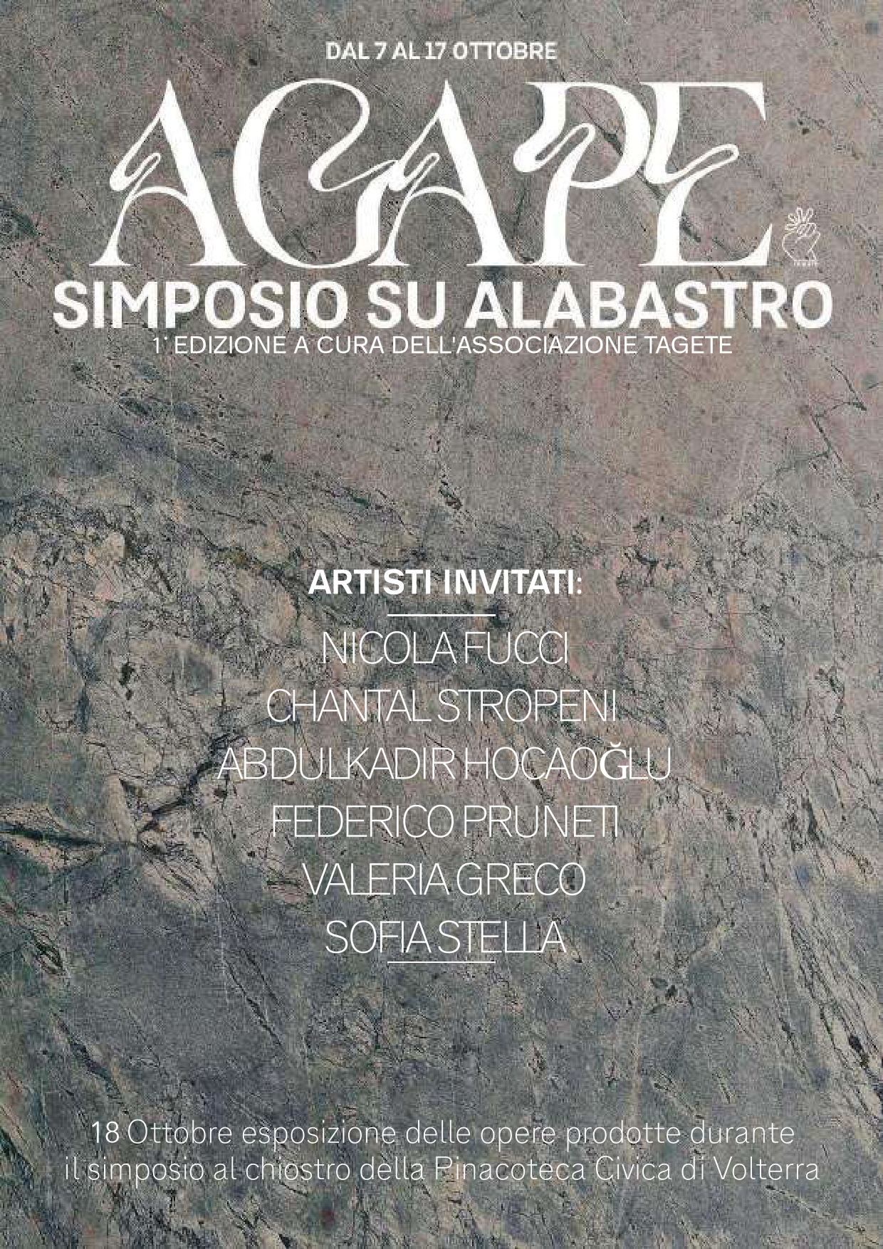 L’Associazione Culturale Tagete è lieta di annunciare il Primo Simposio di Scultura su Alabastro, che si svolgerà dal 7 al 17 ottobre 2024 nella storica città di Volterra. 6 artisti invitati! Il 18 inaugurazione mostra alla Pinacoteca di Volterra e pranzo al San Luca degli Alabastrai! Ti aspettiamo