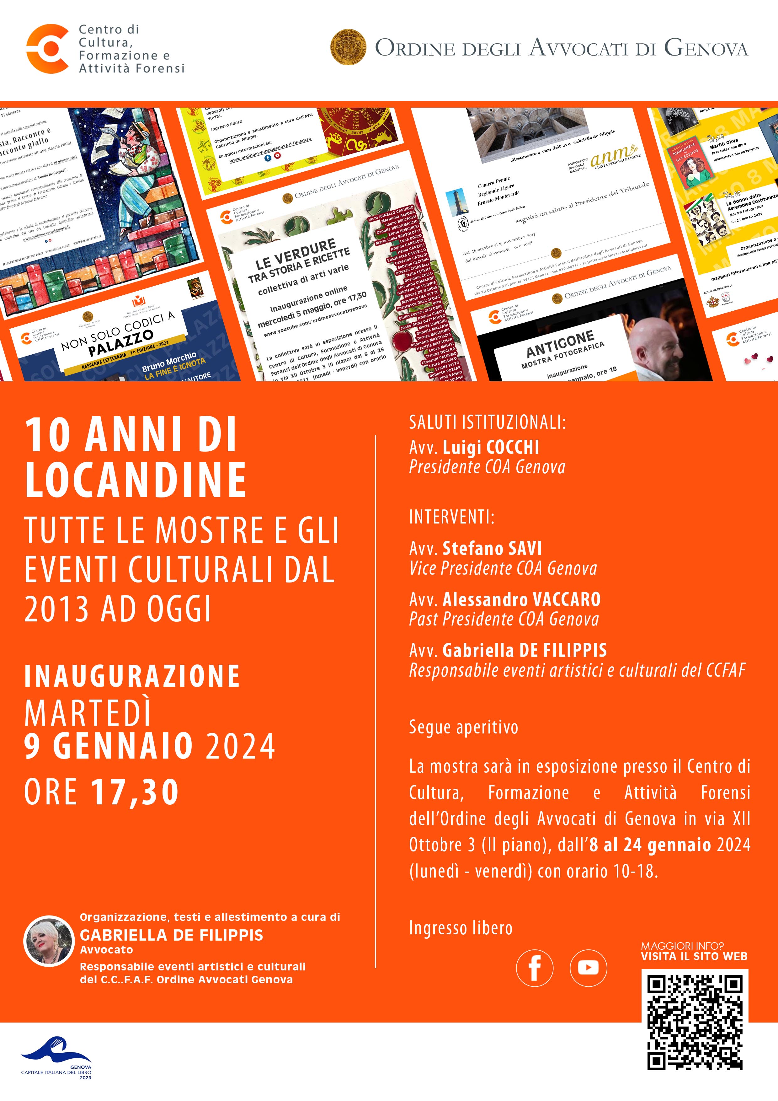 Il 9 gennaio 2024, alle ore 17,30 nei locali del Centro Cultura dell’Ordine degli Avvocati di Genova, in via XII ottobre 3, sarà inaugurata la mostra “10 ANNI DI LOCANDINE” che raccoglie le locandine relative agli eventi culturali e alle mostre organizzate dal 2013 al 2023 e ospitati nel predetto Centro Cultura. In realtà il Centro Cultura, Formazione e Attività Forensi è nato nel settembre 2011 da una idea dell’allora Presidente dell’Ordine degli Avvocati genovesi, avv. Stefano Savi, e la iniziativa è stata poi portata avanti dall’avv. Sandro Vaccaro, a lui subentrato nell’anno successivo.