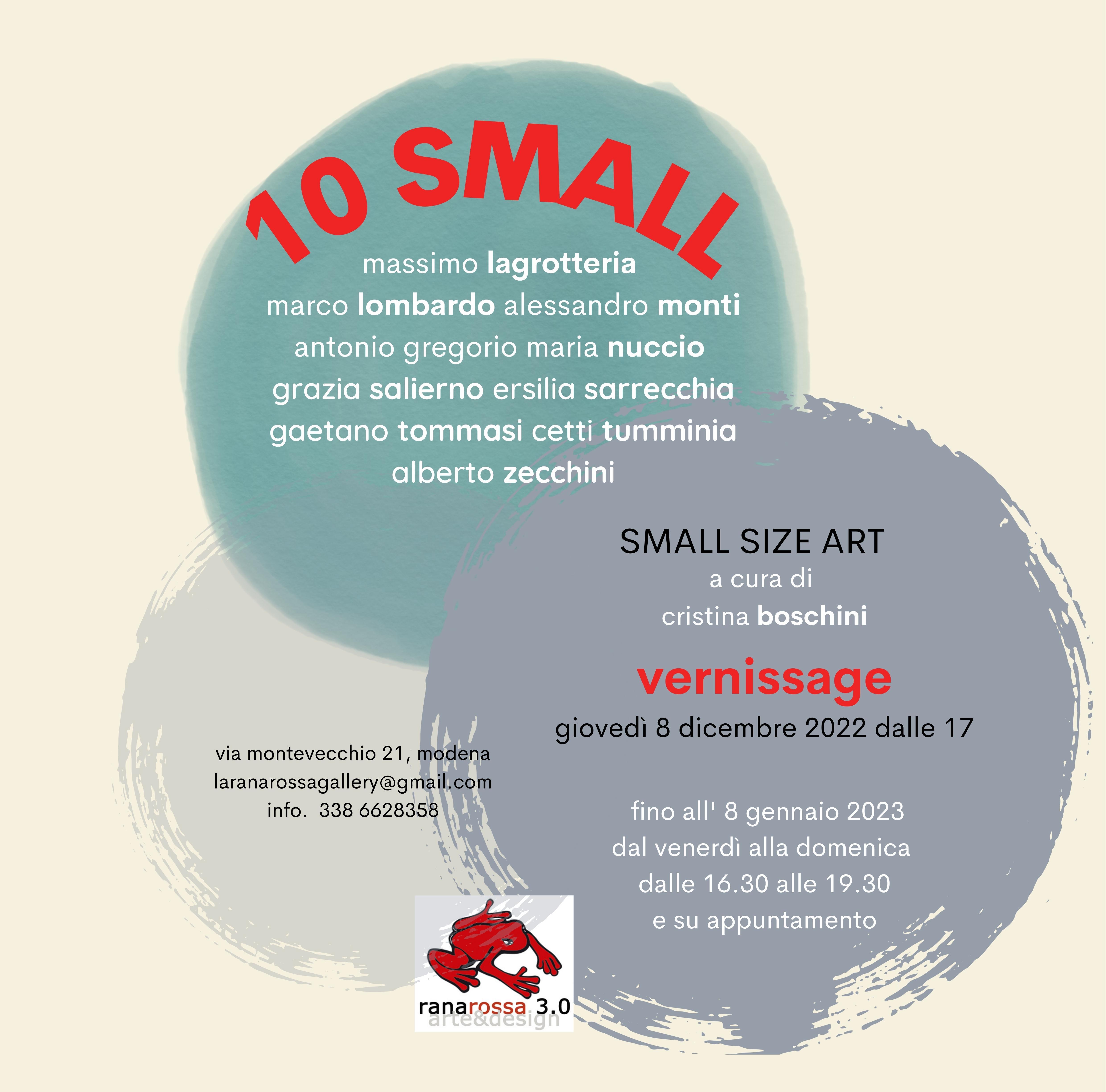 Il limite delle dimensioni coniugato all'illimitato linguaggio dell'arte ritorna in "SMALL", l'attesa esposizione proposta da 'ranarossa 3.0'. L'evento alla sua decima edizione, raccoglie piccole opere realizzate da nove artisti impegnati, con diverse modalità, nella rappresentazione essenziale della propria realtà. Si tratta di un impegno che va 'controcorrente' rispetto agli attuali canoni, che vedono nella disorientante enormità di suggestioni e informazioni la chiave principale di lettura del nostro tempo. Non è lo spazio l'elemento determinante, ma è la volontà di creare un dialogo che va oltre la differenza, quella differenza che nasce dall'unicità espressiva di ogni singolo autore, dalla sua natura, dagli strumenti scelti per dare vita al proprio linguaggio. Quadri, ma anche grafiche e fotografie, che 'nel loro piccolo' offrono al pubblico una visione d'insieme radicata nel dettaglio e valorizzata da un allestimento d'insieme capace di far parlare di sé ogni opera. Per facilitare ulteriormente l'approccio a un'arte di piccole dimensioni, ma non per questo minore, gli autori mettono a disposizione del pubblico alcuni pezzi che possono essere acquistati a un costo ridotto. Donare un'opera d'arte, a se stessi o ad altri, è una grande opportunità, perché ci rende capaci di condividere un'emozione che ha dato vita a un'idea ed esula dal tempo.