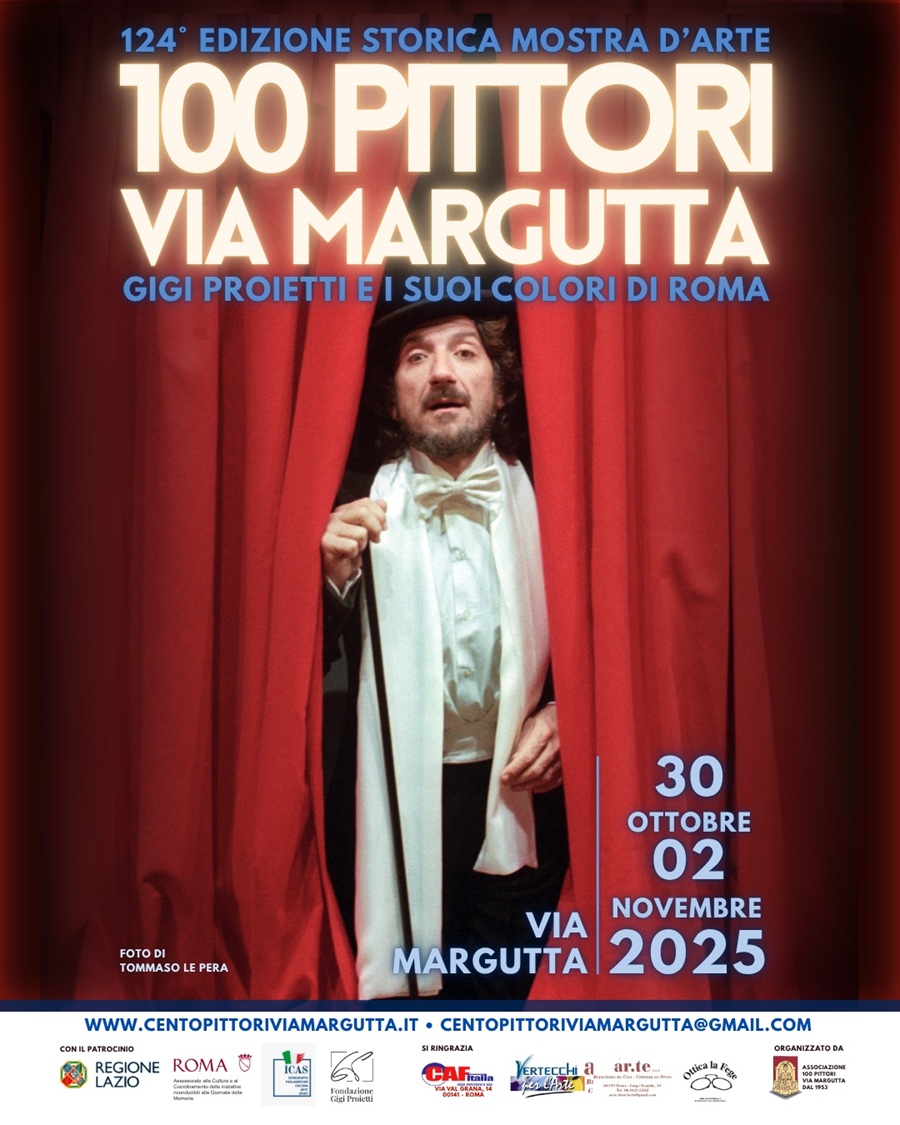 La storica manifestazione rende omaggio al grande Maestro nella sua Roma, città eterna dove storia, bellezza e creatività si intrecciano ad ogni angolo, ed è stata palcoscenico e fonte d’ispirazione per la genialità di uno dei più amati artisti italiani. Gigi Proietti, attore, autore, regista e poeta della romanità e nazionale, ha saputo raccontare l’anima di questa città come nessun altro: con ironia, profondità, passione e verità. Oggi, attraverso i colori, i pennelli e le tele degli Artisti di Via Margutta, Proietti torna idealmente tra le strade che lo hanno visto nascere, crescere e incantare. Questa mostra è un viaggio nella Roma che vive dentro di lui e che continua a vivere grazie a lui. Un tributo fatto d’arte e memoria, di luce e sentimento. Un omaggio al grande artista, eterno come la sua città.