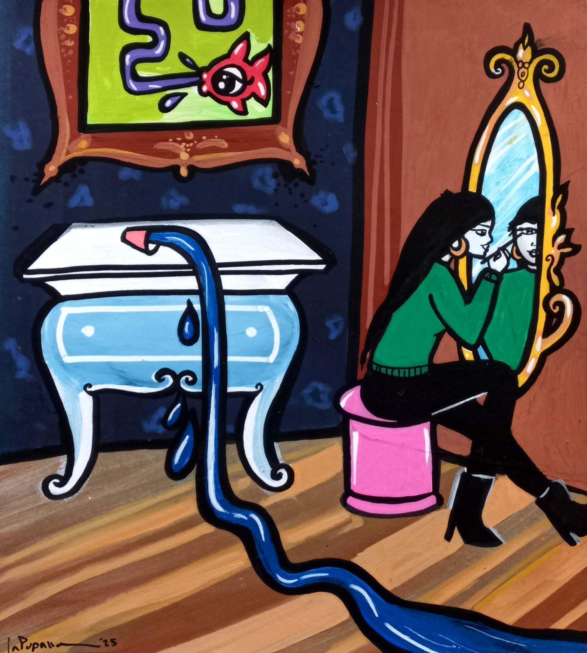Attraverso il suo stile onirico e immediatamente riconoscibile, la Pupazza trasforma l’autoritratto in un territorio di esplorazione psicologica e simbolica. Ogni opera è una soglia che conduce a una nuova versione di sé: la sua figura si moltiplica in pose teatrali, si dissolve, si traveste, dialogando con oggetti, simboli ricorrenti e paesaggi surreali che emergono dall’inconscio. La pittura diventa un'autobiografia che non pretende di essere ordinata, ma si esprime piuttosto in un vero e proprio atlante visivo dell’identità.