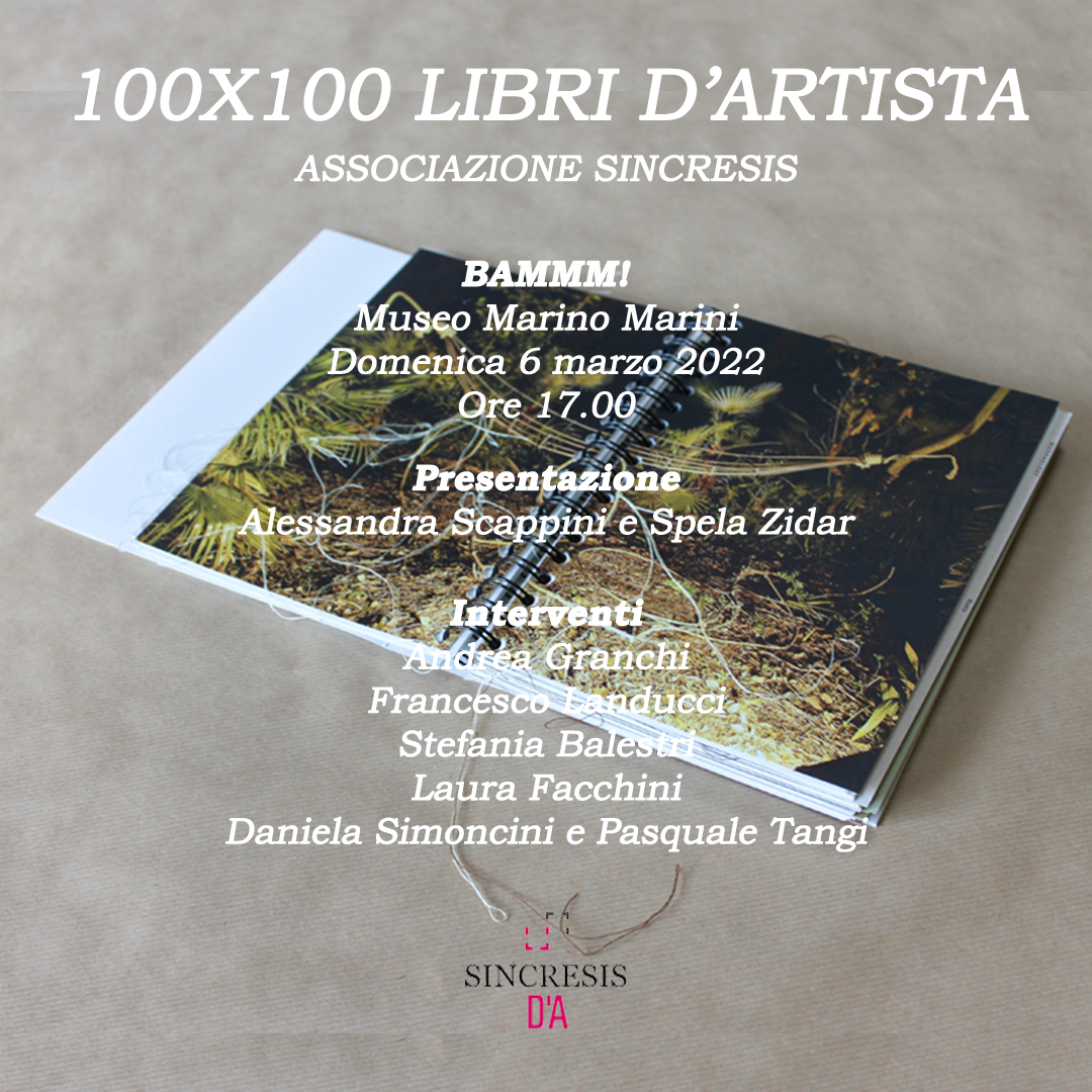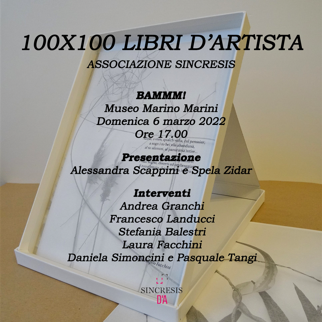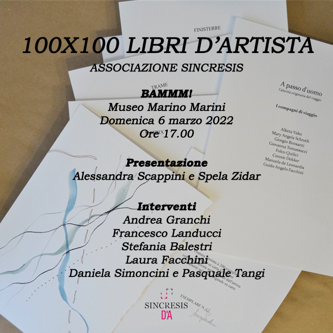 L’esposizione 100X100 Libri d’artista, promossa da SINCRESIS -D'A Spazio d'arte, viene presentata in anteprima in occasione di BAMMM!, un evento dedicato al libro d'arte organizzato dal Centro Di di Firenze in collaborazione con il Museo Marino Marini di Firenze. La mostra, che inaugurerà il 12 marzo 2022 a Empoli, riunisce libri-opere di artisti provenienti da tutta Italia e anche dall’estero, dalla Spagna al Belgio, dalla Francia all’Inghilterra. Numerose sono specialmente le presenze femminili che hanno aderito alla proposta.