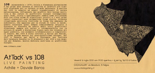 dadagallery in collaborazione con attack (associazione d’arte contemporanea) presenta una live performance di 108. l’evento, che si terrà nei locali di dadagallery e nelle vie adiacenti, vedrà il famosissimo writer creare un’opera all’interno della galleria.