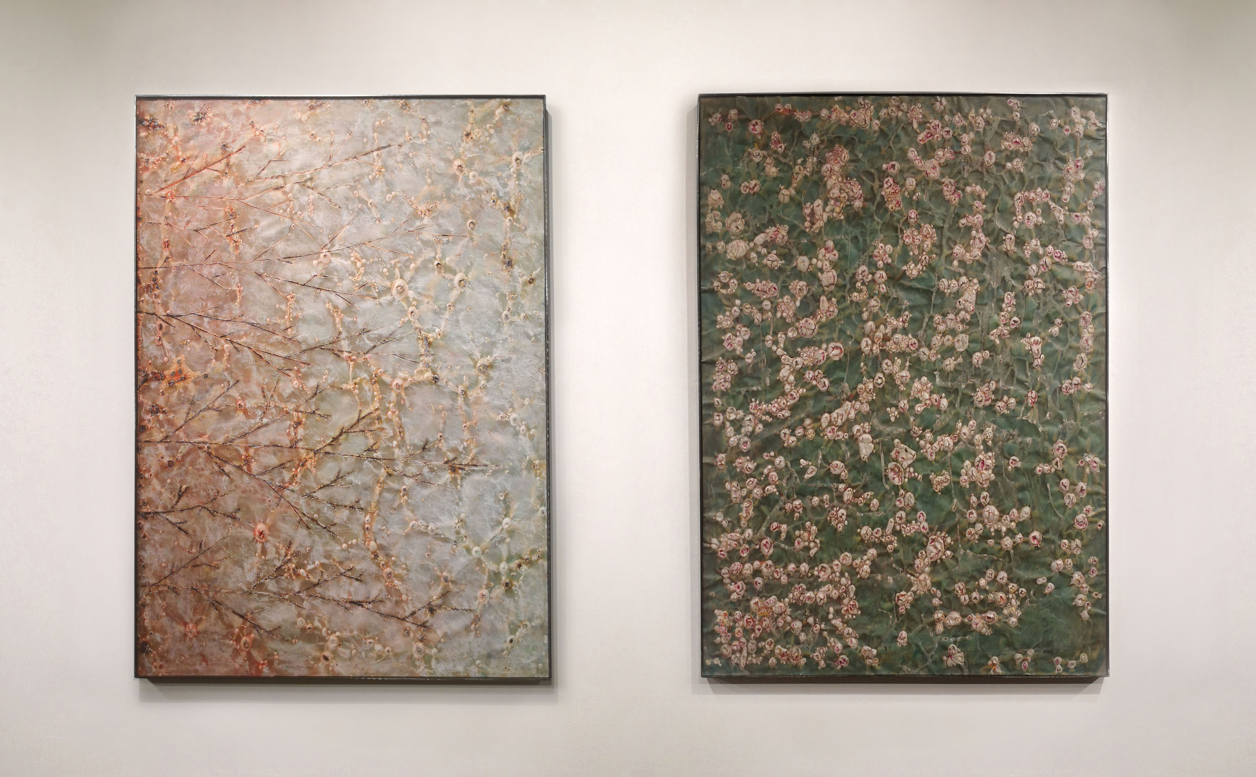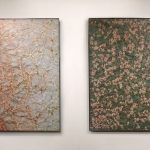 Sono 13 i “dittici” esposti, ovvero coppie di opere di dimensione 70x100 cm, incorniciate in metallo, dal valore cromaticamente evocativo e in dialogo fra loro; un corpus di lavori che determina un’impaginazione visuale dello spazio, complice anche un particolare allestimento, capace di suggestionare per varietà e potenzialità visiva: dimensioni aniconiche in cui lo sguardo può interrogarsi sulla percezione di una reale evidenza quanto del celato dalla realtà dell’opera. “È così che la Natura, grazie al filtro dell’artista, può ritrovare la propria immagine attraverso un “fare” antropizzato, - si legge nelle note del curatore che accompagnano la mostra, - “un “inganno” che evidenzia la polivalenza della materia quando incontra il sentimento creativo, la visione poetica. È il caso della “biomimica” di Roberto Giacomucci, una “imitazione” della natura attraverso l’uomo che diventa sintonizzazione della vita su frequenze di equilibrio ad alto contenuto di bellezza. Le opere, questi “elementi di biomimica”, danno lo spunto al concetto sottinteso alla mostra, 1+1=3: è la somma dei dittici esposti, così come il rapporto visivo tra fruitore e opera, a creare una sinergia di due elementi capace di produrre un risultato maggiore della semplice somma degli stessi”.