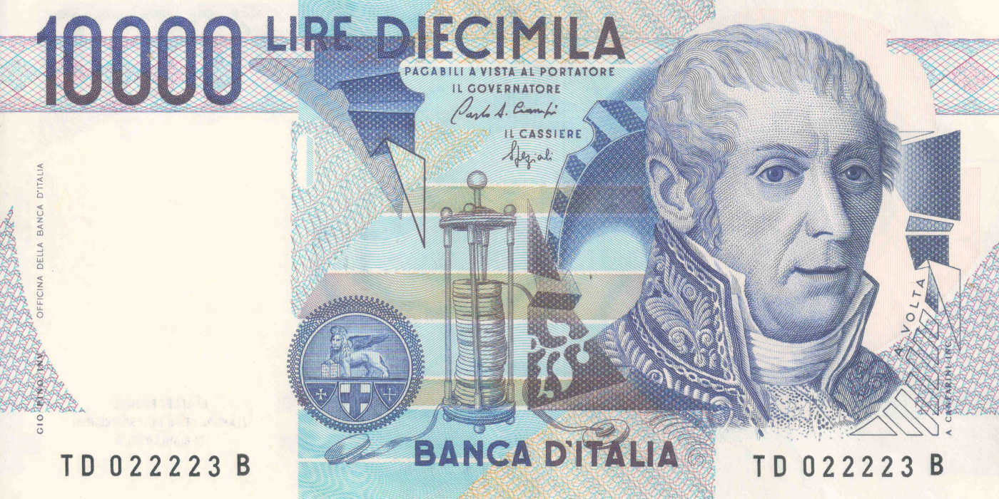 Sul recto della banconota da 10.000 lire in circolazione dal 1984 fino al 1999, l’anno di avvento dell’euro, spiccava un ritratto dal sapore ottocentesco che, per gli Italiani quantomeno trentenni, è tuttora un caposaldo dell’immaginario collettivo. Il personaggio effigiato di tre quarti era Alessandro Volta nella versione schizzata dal vero da Giovita Garavaglia. Accanto allo scienziato, la banconota raffigurava il primo modello della sua invenzione più celebre, la pila. Sul verso era invece riprodotto il Tempio eretto a Como, città natale di Volta, nel 1927, in occasione del centenario della sua scomparsa.