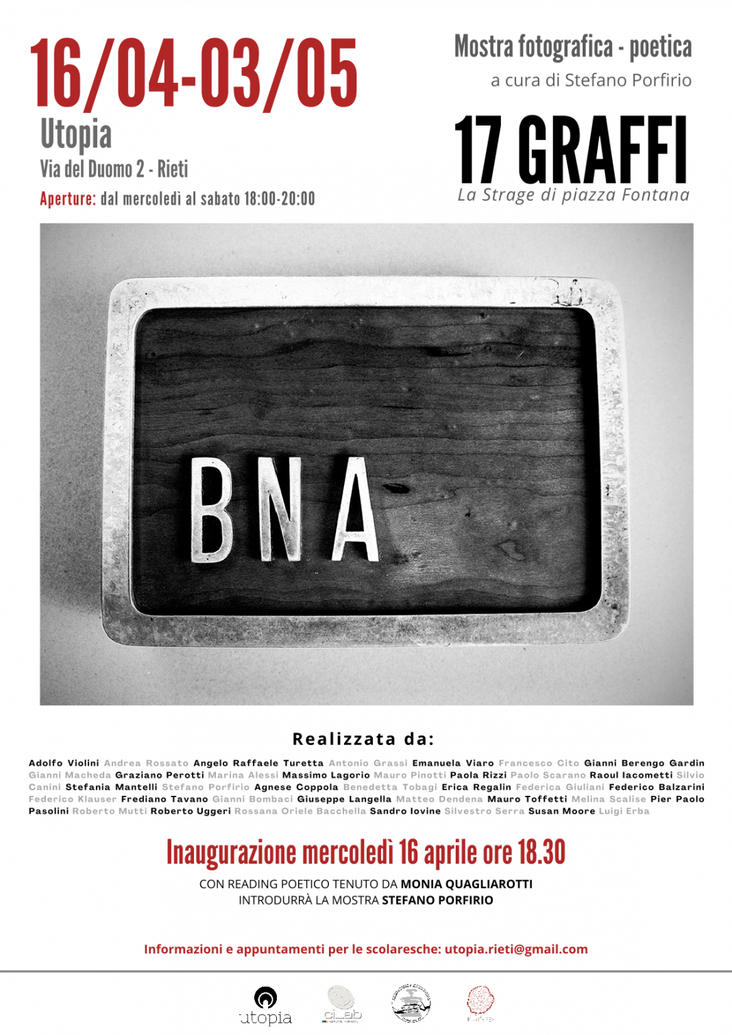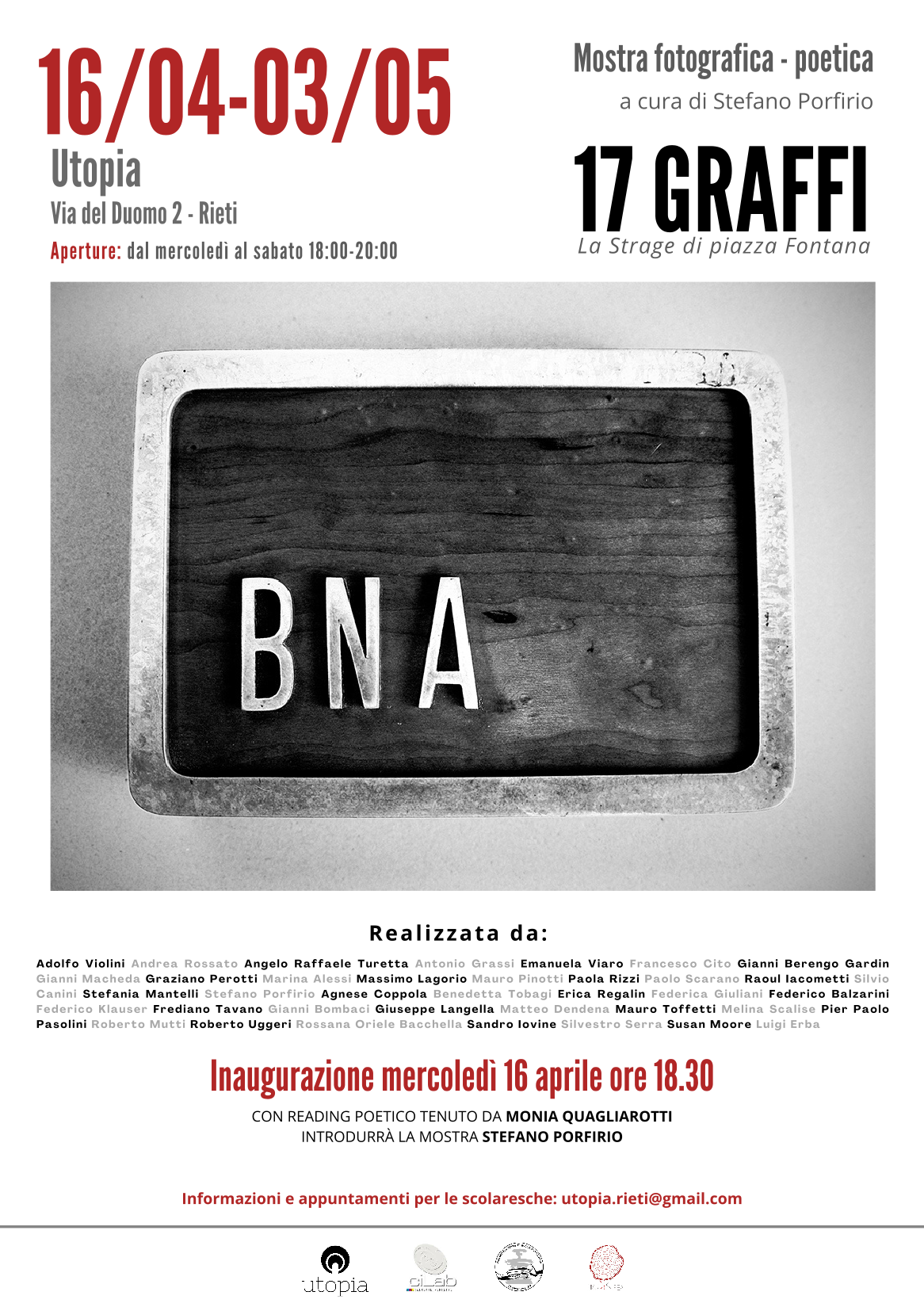 "17 graffi" è un'emozionante mostra a ricordo della strage terroristica di piazza Fontana dove, nel 1969, morirono 17 persone uccise dall'esplosione di una bomba collocata all'interno della Banca nazionale dell'agricoltura di Milano. Curata dal fotografo Stefano Porfirio e già esposta in precedenza a Milano, Campobasso e Roma, la mostra giunge a Rieti grazie all'impegno dell'associazione fotografica Utopia e si dipanerà attraverso 17 foto più una, sintesi di tutta l'esposizione, e altrettanti testi poetici in ricordo delle 17 vittime; autori degli scatti una pluralità di artisti, dal semplice appassionato al fotografo professionista, fino a giungere ad autori affermati come Gianni Berengo Gardin, Angelo Raffaele Turetta e Francesco Cito. L'esposizione sarà inaugurata mercoledì 16 aprile alle 18.30, potendo contare sulla presenza del curatore Stefano Porfirio, che introdurrà la mostra ai visitatori guidandoli tra gli scatti esposti. Nella stessa occasione sarà recitata una selezione dei testi poetici che accompagnano le fotografie i quali, grazie alla lettrice Monia Quagliarotti, si uniranno alle immagini offrendo un'esperienza emozionante e suggestiva. Nei giorni successivi la mostra rimarrà aperta dal mercoledì al sabato, dalle 18 alle 20, fino a sabato 3 maggio. L'ingresso sarà, come costume di Utopia, libero e gratuito.