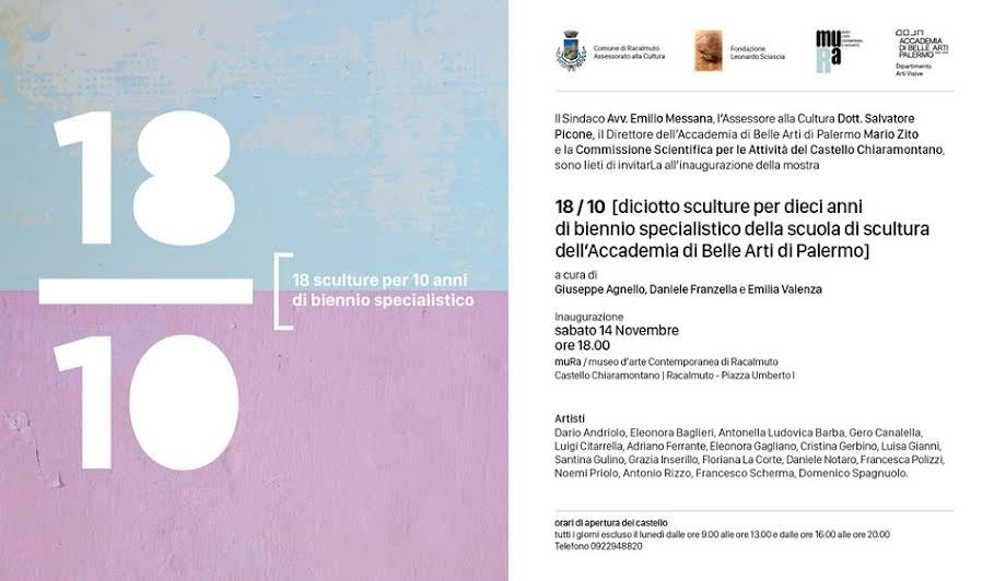 Sarà inaugurata il prossimo 14 novembre alle ore 18.00 nelle sale del nascente muRa, Museo dell’Arte Contemporanea presso il Castello Chiaramontano di Racalmuto, “18/10. Diciotto sculture per dieci anni di biennio”, una mostra degli studenti dell'Accademia di Belle Arti di Palermo, per celebrare i primi dieci anni di attività didattica del biennio specialistico in Scultura.