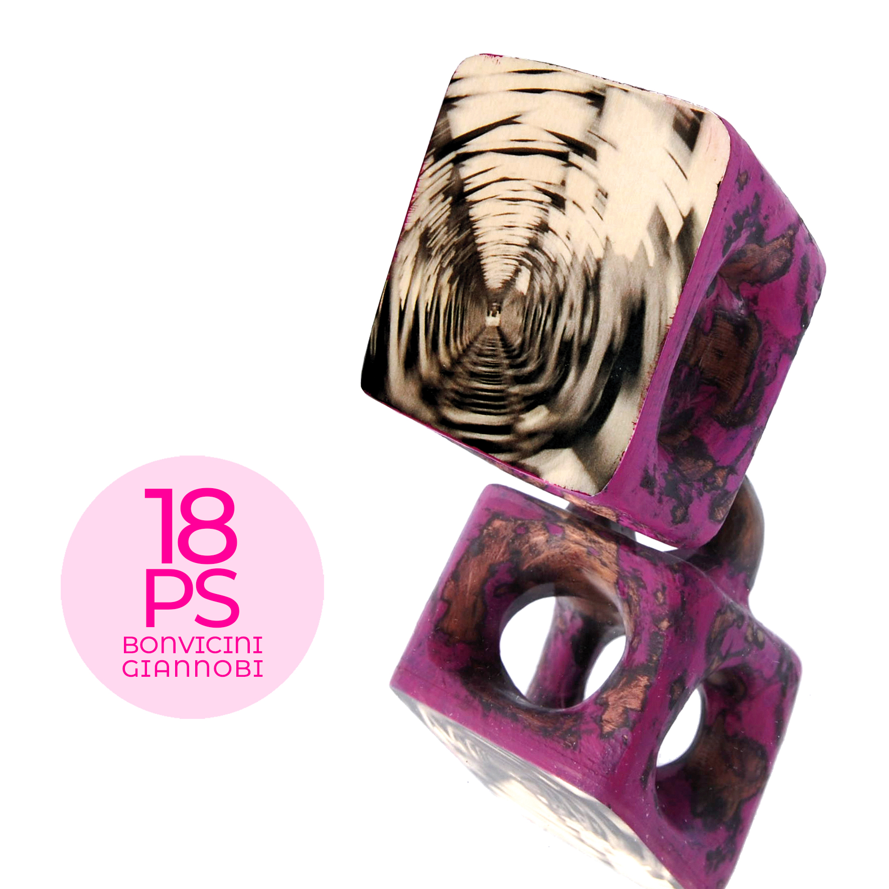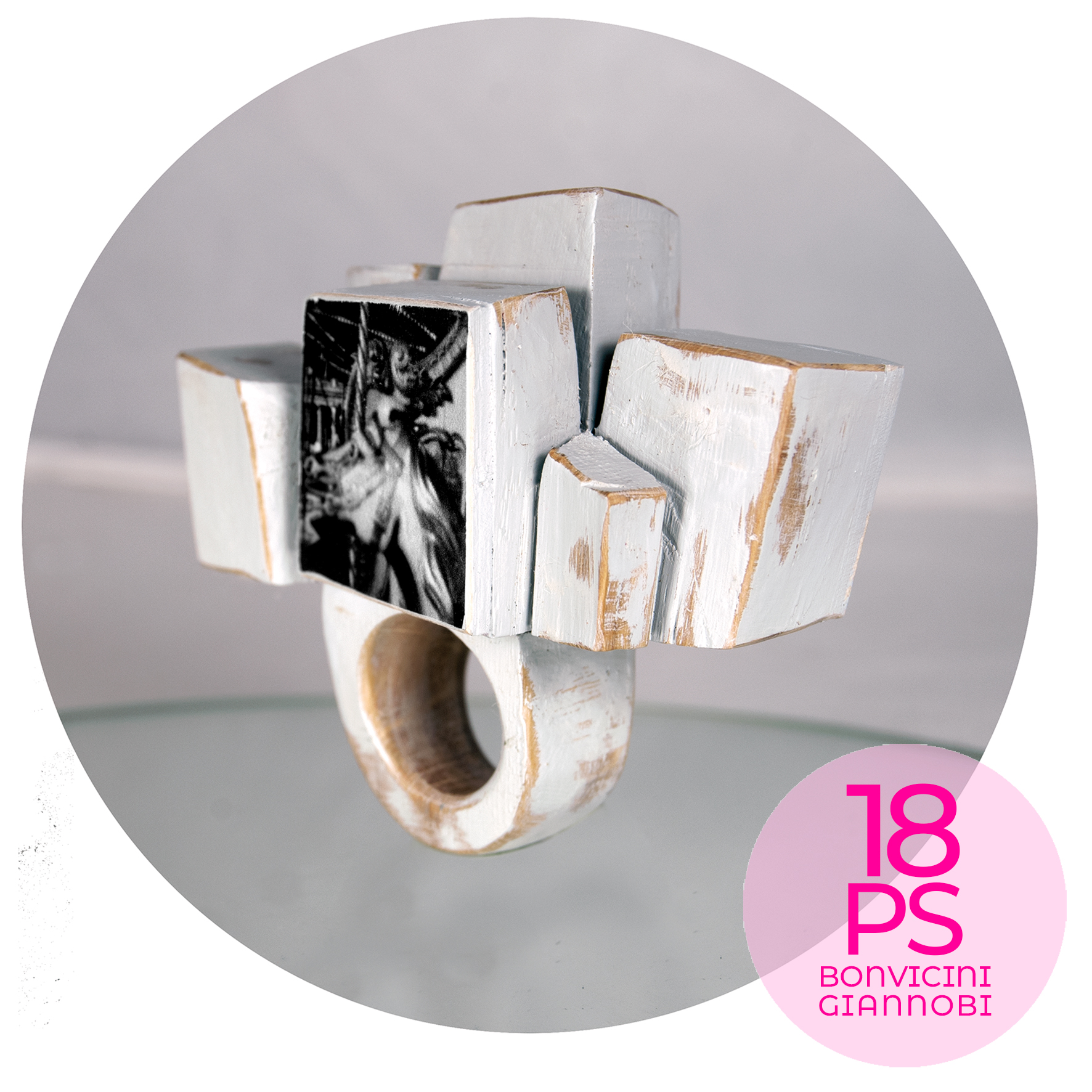 La collaborazione tra Fabrizio Bonvicini, maestro scultore di architetture indossabili e Marina Giannobi, fotografa di percezioni notturne, porta alla realizzazione di una serie di anelli in legno con inserti fotografici.