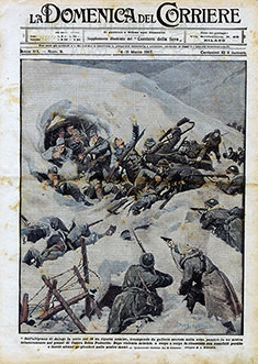Con l’entrata in guerra, nel 1915, dell’Italia, Luigi Albertini, il geniale direttore del “Corriere della Sera”, uno dei principali fautori dell’Interventismo, decideva che bisognava cambiare il taglio delle illustrazioni: comunicare i fatti della guerra era importante quanto combatterla e, quindi, le copertine illustrate della «Domenica» non dovevano angosciare e allarmare il lettore ma avvicinarlo alla guerra, considerata come un fatto ineluttabile.