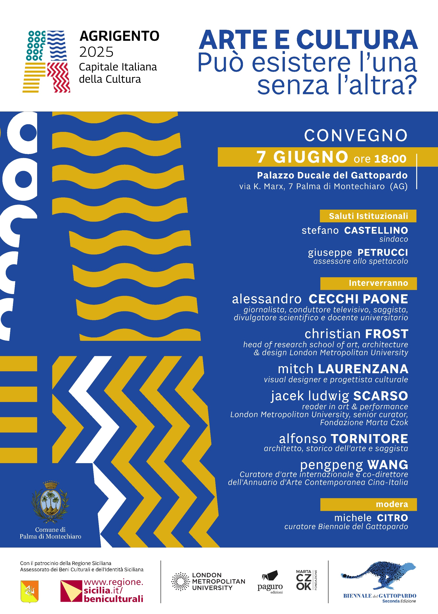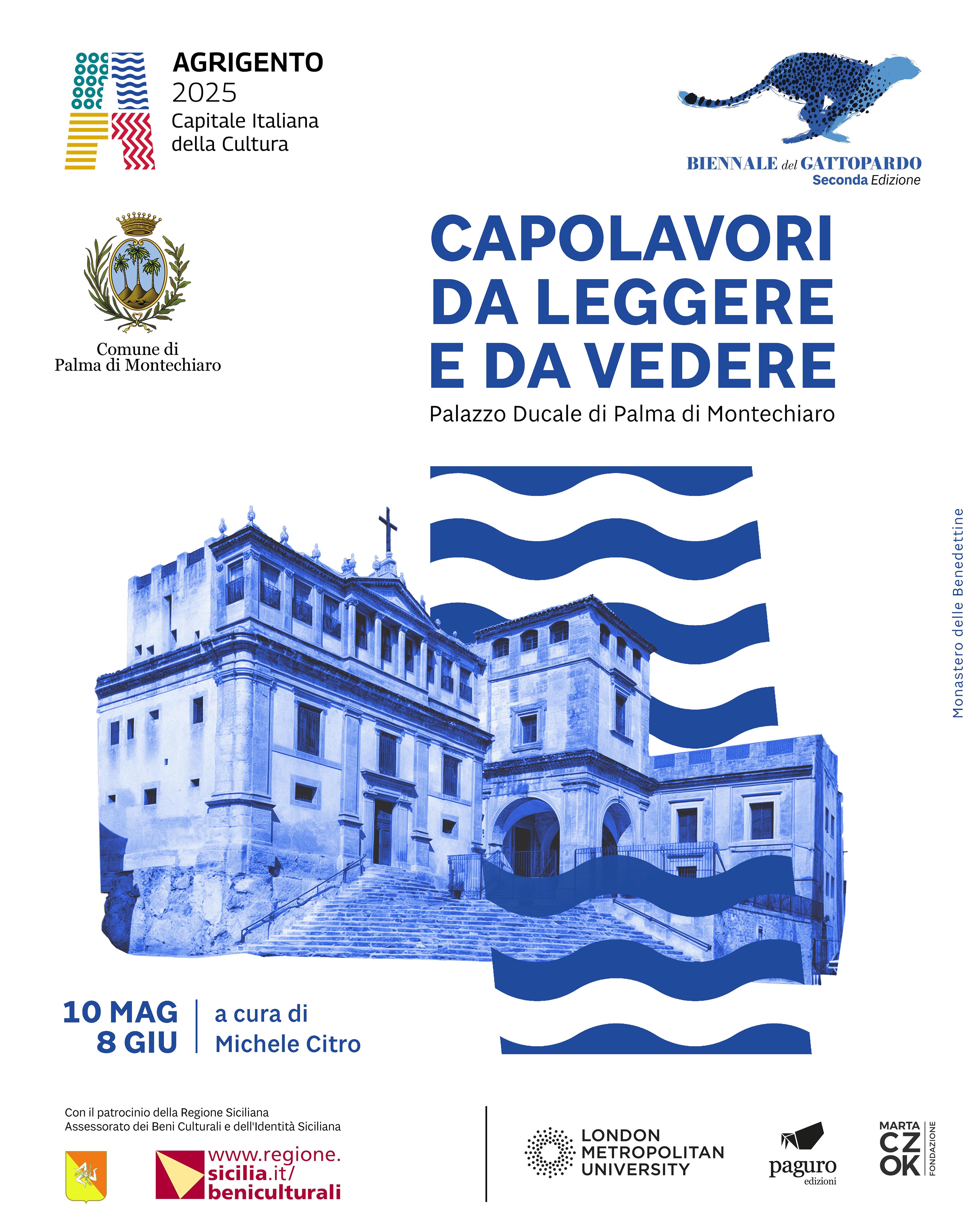 Dopo circa due anni dal successo di «HOMODEUS. Il Dilemma dell’UomoDio», il Comune di Palma di Montechiaro (AG) — sotto la guida dell’attivo e costante Sindaco Stefano Castellino, coadiuvato da un team di solerti assessori e consiglieri, fra cui l’Assessore allo spettacolo Giuseppe Petrucci — ritorna sulle scene della grande arte contemporanea con «Capolavori da leggere e da vedere». Questo il titolo della Seconda Edizione della Biennale del Gattopardo, che verrà ospitata, dal 10 maggio all'8 giugno 2025, nel suggestivo Palazzo Ducale in via Karl Marx 7.