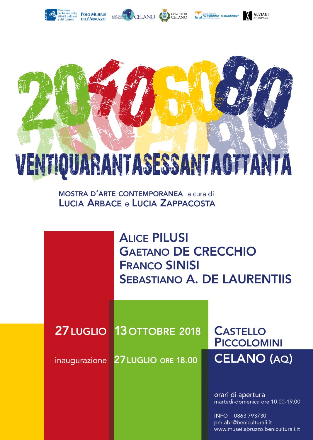 Il Polo Museale dell’Abruzzo in collaborazione con Alviani ArtSpace, centro di ricerca e sperimentazione sul contemporaneo, propone la mostra 20 40 60 80 presso il Castello Piccolomini di Celano che sarà inaugurata venerdì 27 luglio alle ore 18.00 e che si potrà visitare fino al 13 ottobre, in occasione della giornata del contemporaneo, evento nazionale organizzato da Amaci.