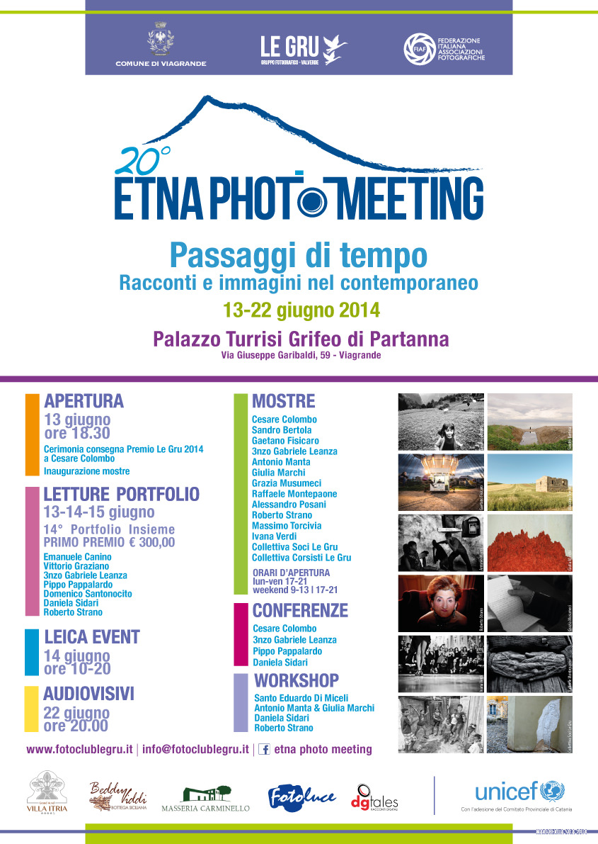 Il Gruppo Fotografico Le Gru di Valverde organizza l’edizione numero 20 dell’Etna Photo Meeting. La manifestazione avrà come tema “Passaggi di Tempo. Racconti nel contemporaneo” e si svolgerà a Viagrande dal 13 al 22 giugno 2014.