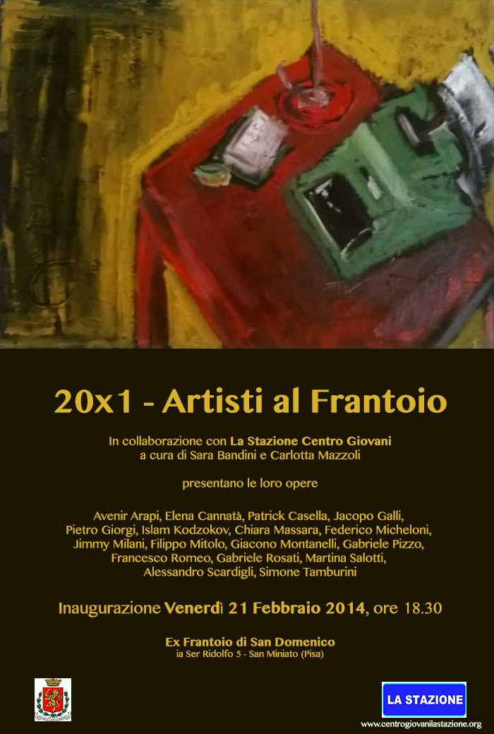 Si apre Venerdì 21 Febbraio 2014 la mostra dal titolo 20x1 – Artisti al Frantoio. Curata dall'Associazione La Stazione di San Miniato Basso, la mostra segna il ritorno negli spazi dell'ex Frantoio di San Miniato degli eventi dell'associazione sanminiatese, dopo il grande successo della mostra GATTAROSSA COMING SOON: allegoria del viaggio, dello scorso Novembre.