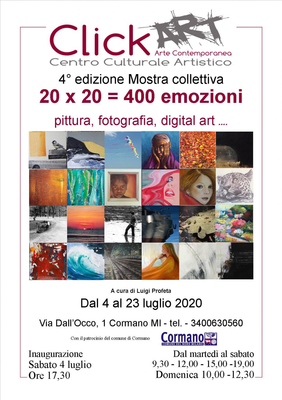 Sabato 4 luglio, infatti, a partire dalle 17,30 il centro culturale Click Art di Cormano, in via Dall'Occo 1, sede del movimento psicoavanguardia ideato da Luigi Profeta, inaugurerà la 4° edizione della collettiva 20x20 = 400 emozioni che rimarrà visitabile ogni giorno fino al 23 dello stesso mese.