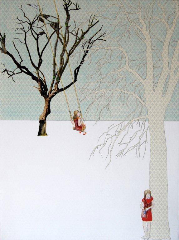 Anche Alice Colombo descrive l’età dell’infanzia, ma la sua è un’osservazione privata, solitaria. Nelle sue opere, ambienti apparentemente domestici, familiari, rivestiti di una rassicurante carta da parati gigliata, sono abitati da una sola bambina. Lontana dal resto, in un silenzio desolato e in una distanza che sembra possa essere interrotta da un filo, da un telefono per una comunicazione, l’esterno irrompe nella scena attraverso un ramo d’albero, spezzando, attraverso una forma di vita, una sospesa attesa malinconica.