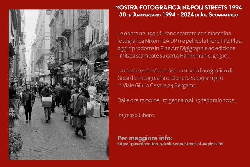 Gicardo Fotografia in occasione dei 30 anni dalla realizzazione dei scatti fotografici del 1994 Streets of Naples, presenterà una mostra fotografica dell'autore Joe Scognamiglio dove si terrà presso lo Studio fotografico di Gicardo Fotografia FINE-ART Digigraphie di Donato Scognamiglio in Viale Giulio Cesare, 24 Bergamo (BG).