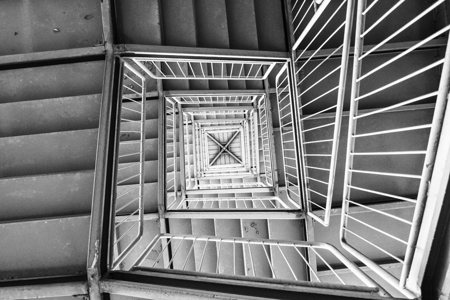 Linee e forme geometriche costruiscono edifici desolati, bianchi e neri.