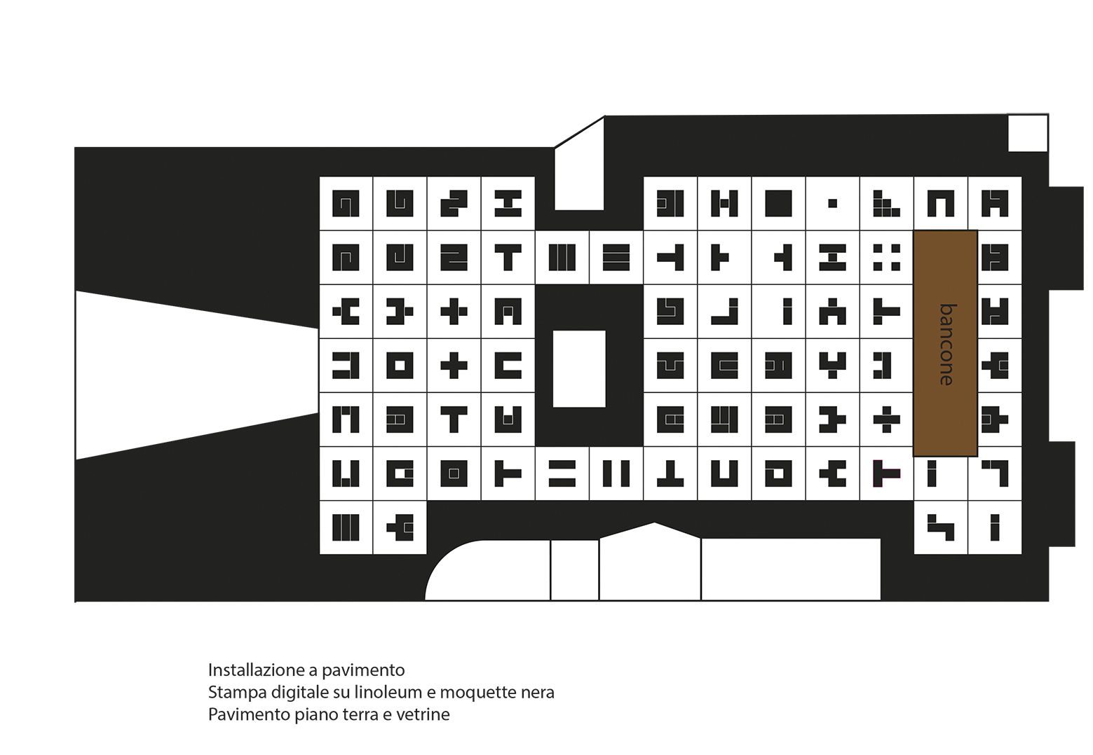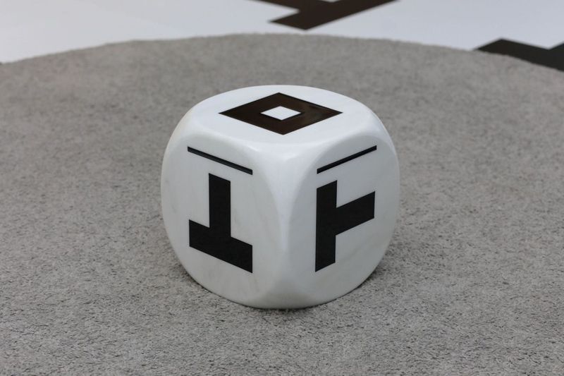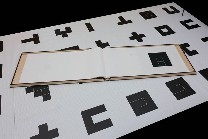 Entrando in “3X3 chiuso semiaperto aperto”, lo spazio di EMM / Ex Maglierie Mirella accoglie lo spettatore in una dimensione misteriosa e surreale, in cui ogni elemento contribuisce a una ritualità esperienziale. Dalle vetrine esterne, che richiamano le decorazioni di un edificio di culto, alla pavimentazione, completamente rivestita da una stampa digitale su linoleum, lo spazio si fonde con l’opera stessa. Il pubblico interagisce con i segni modificando il proprio punto di vista e generando incertezze, in un continuo gioco di interpretazioni. Dal soffitto una proiezione luminosa evoca la cupola di un luogo sacro. Al centro dell’esperienza, come un’offerta posta su un altare, un dado in marmo, simbolo di casualità e incertezza. E il “Libro delle Composizioni”, un volume artigianale in grande formato, elemento fondamentale della mostra, un oggetto monumentale che invita lo spettatore a indagare la sintesi di un pensiero visivo complesso.